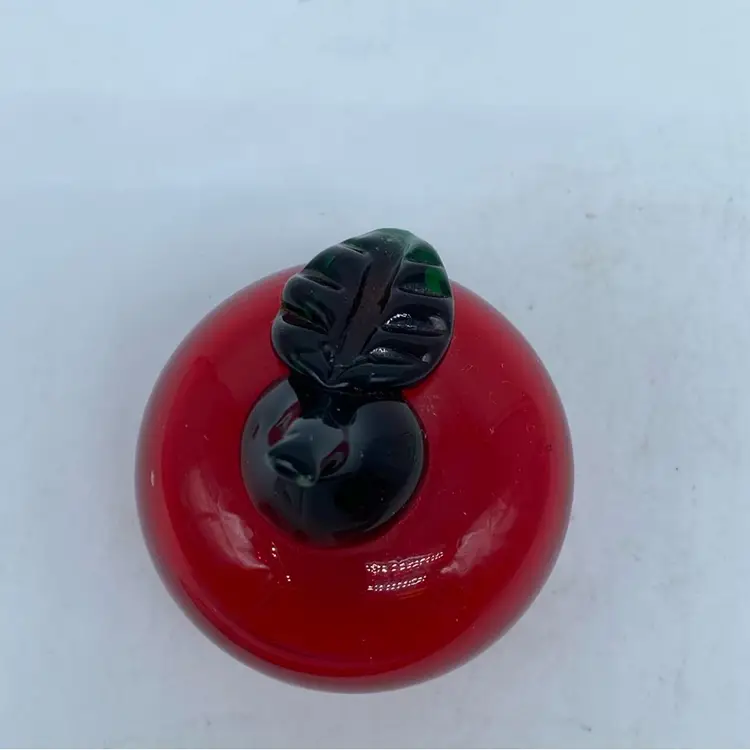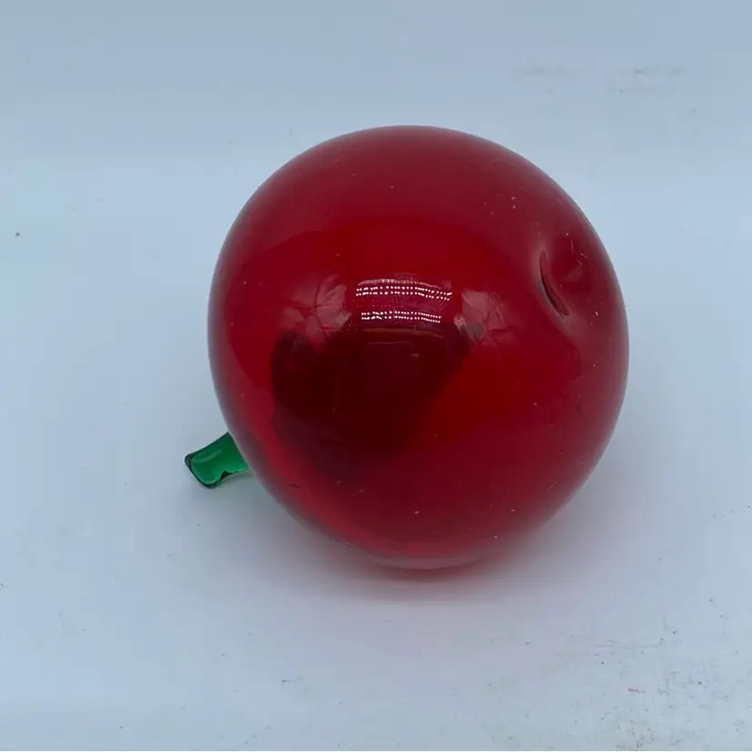 Decorative glass fruit, such as this apple figurine, gained popularity throughout the 20th century as affordable and attractive home decor. Often produced in Murano, Italy, or by various glassworks in the United States and other countries, these pieces were made using techniques like free-blowing and lampworking. They were sold in gift shops, department stores, and collectible markets, appealing to a wide audience.