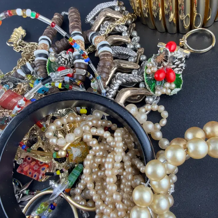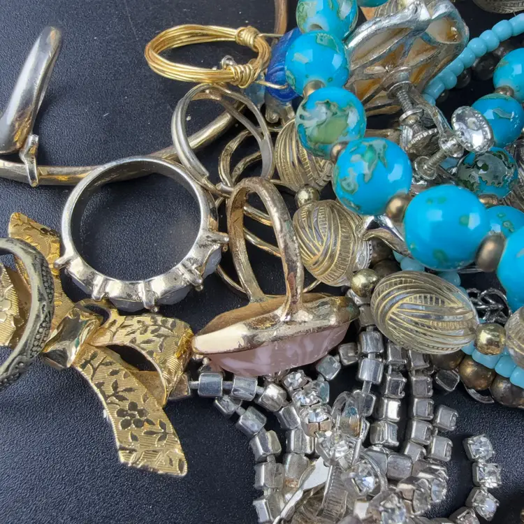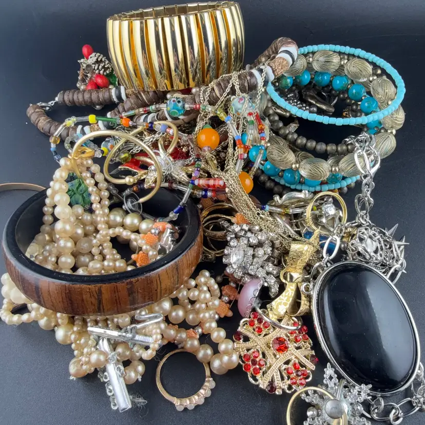 Contains wearable and craft jewelry. Some are in a perfect condition and some have signs of where or a couple missing stones. Some vintage some modern. Buying as is.