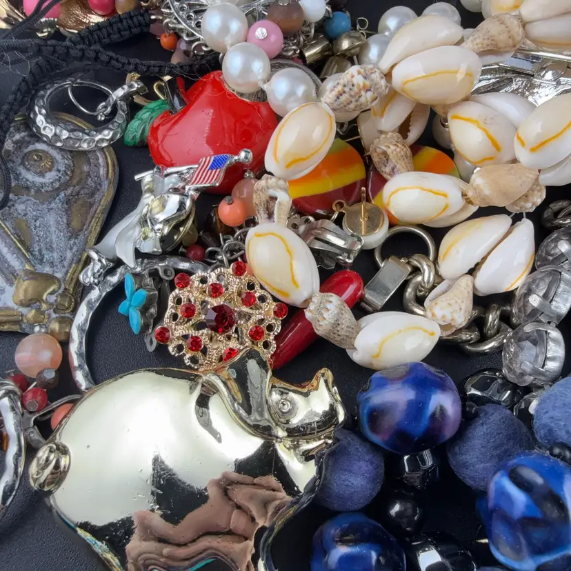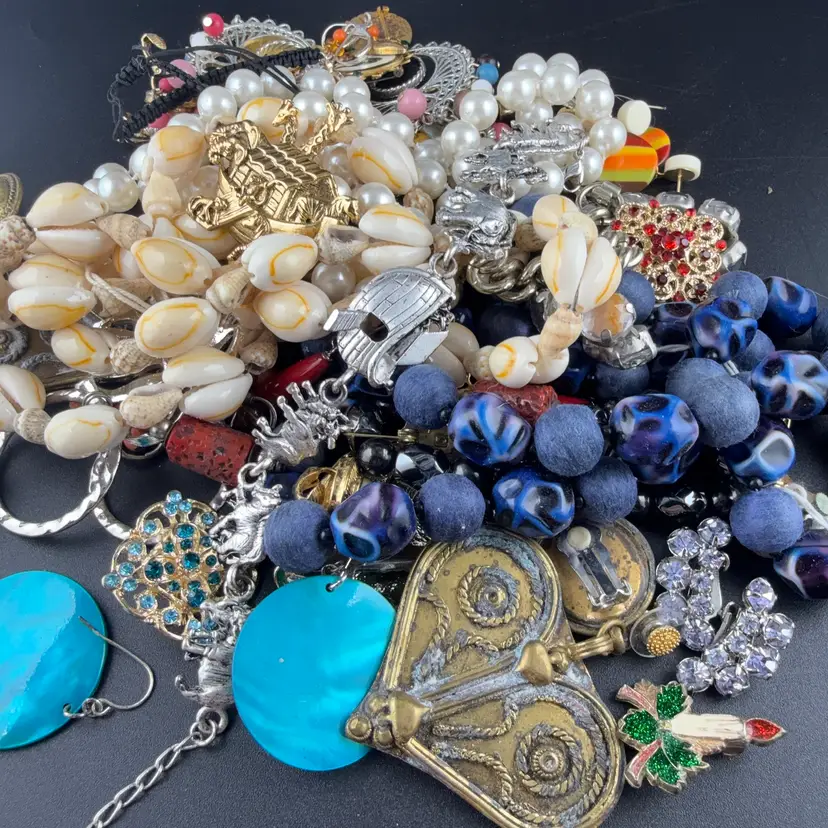 Contains wearable and craft jewelry. Some are in a perfect condition and some have signs of where or a couple missing stones. Some vintage some modern. Buying as is.