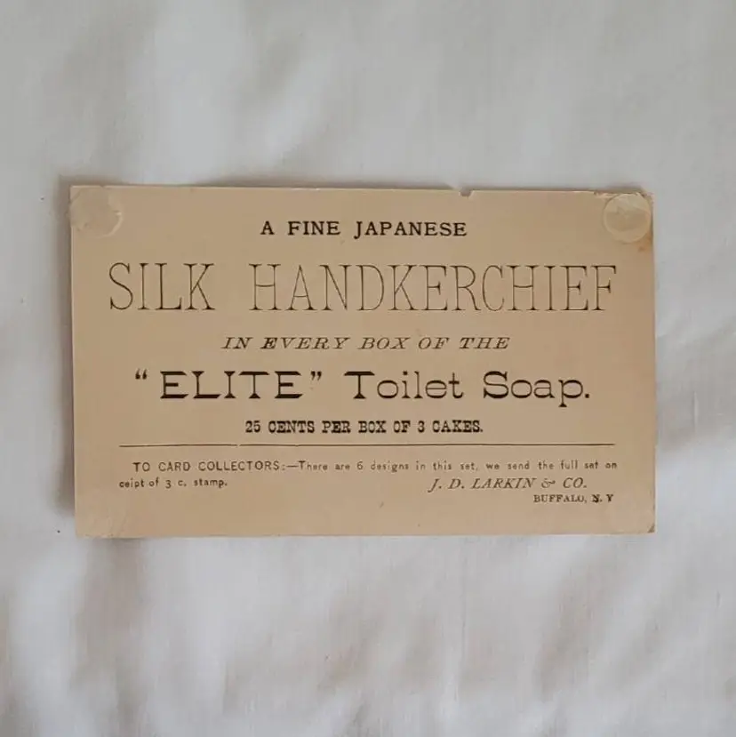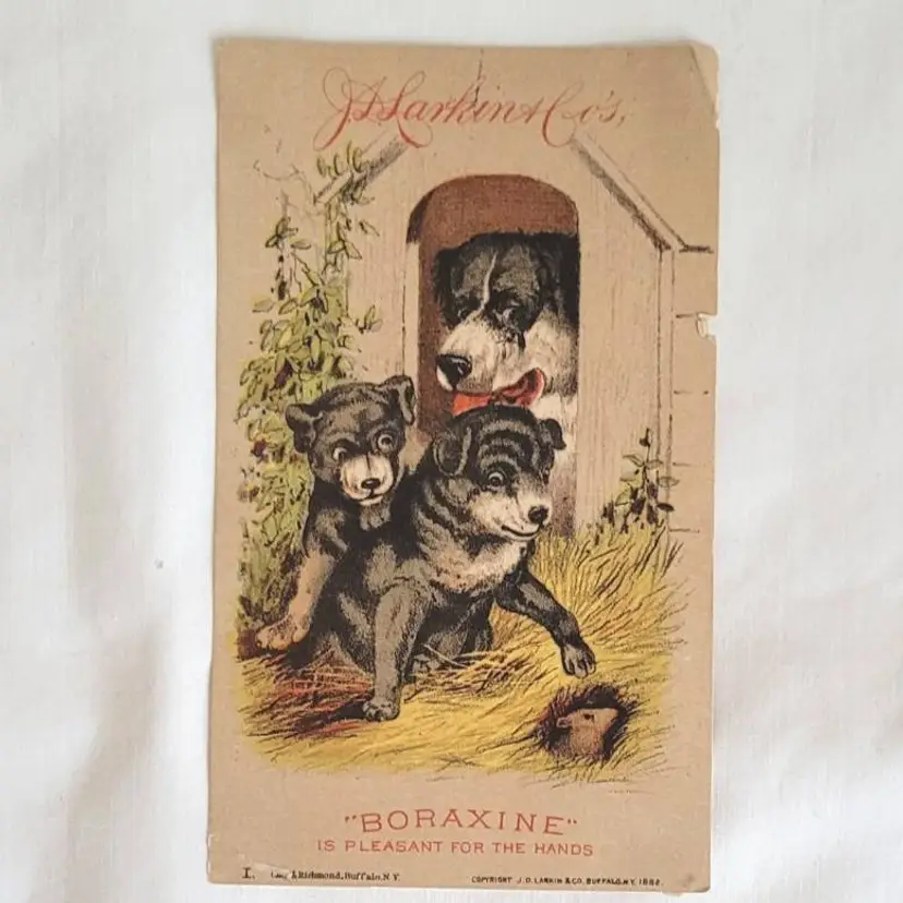Vintage Boraxine advertising trade card, 1880's. It features promotional text on the reverse noting that a “fine Japanese silk handkerchief” was included with purchase Card shows age‑appropriate wear consistent with its age, including light corner and surface wear, but the artwork and text remain clear and display well.