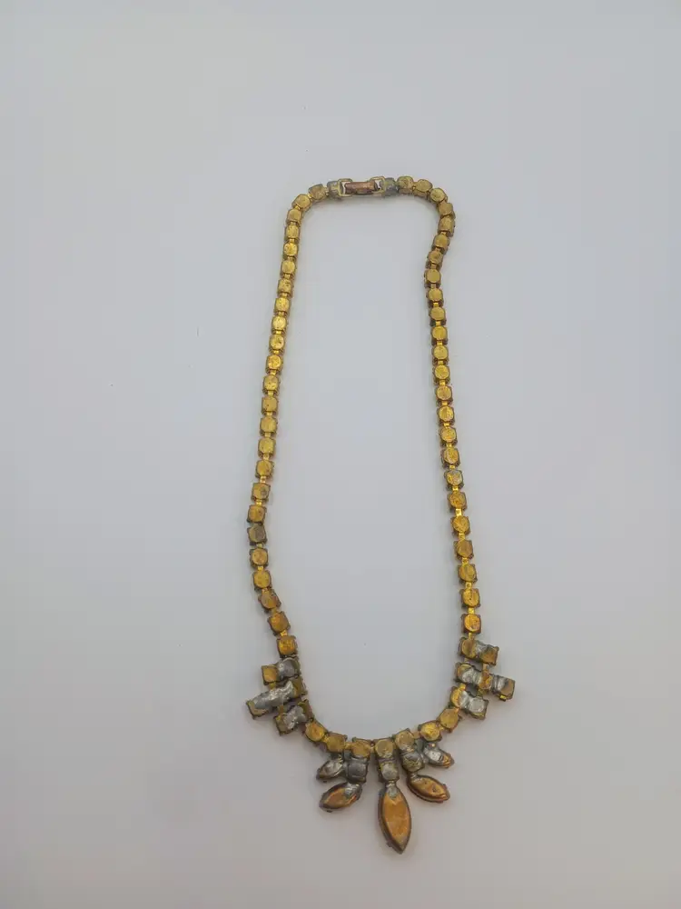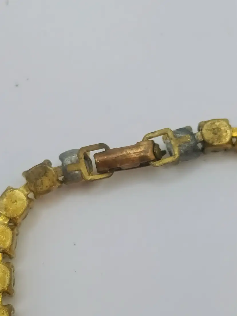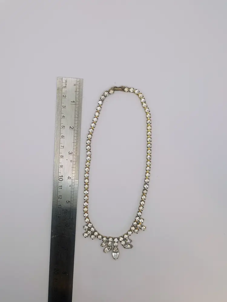 This necklace is Vintage from 1950. It has clear rhinestones all clear and none have yellowed due to age. Beautiful sparkle. This necklace is approximately 15 inches long. It has a fold over snap clasp. The back is gold tone with silver solder marks. I have many of these if you need more, we can do bulk pricing. Beautiful addition to your jewelry collection. Thanks for looking!