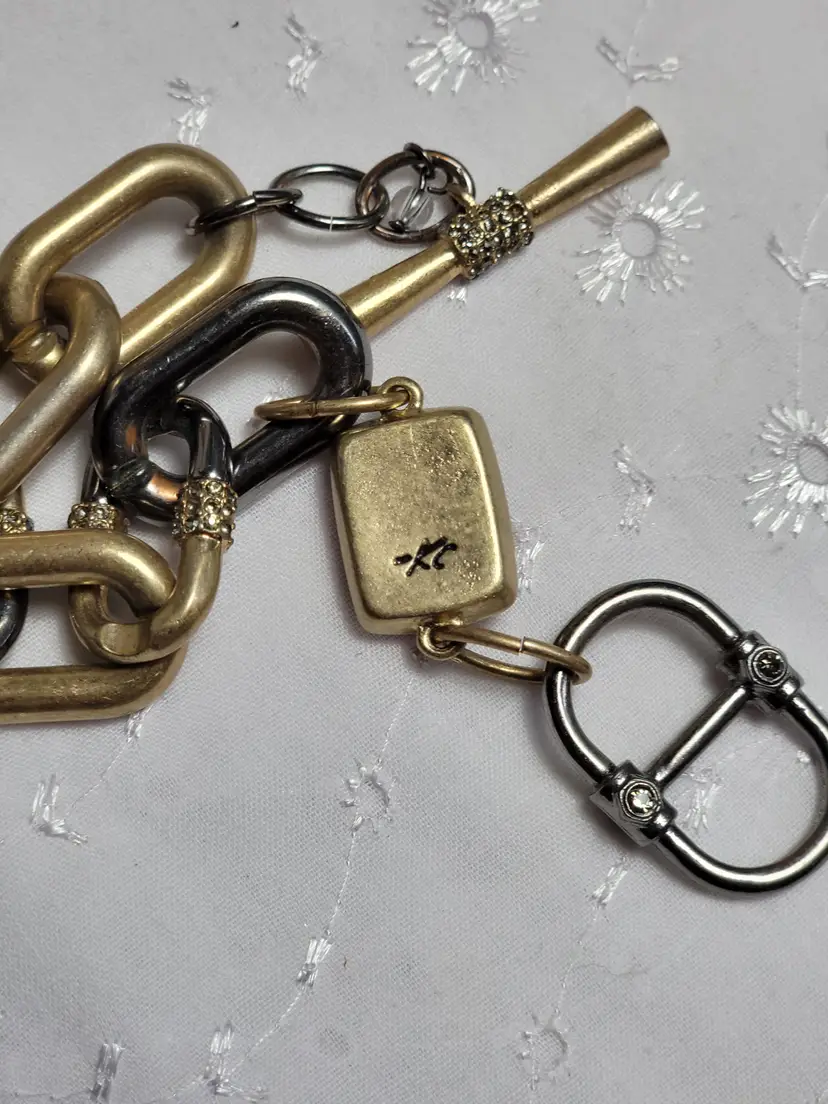 1 ~ tortoise shell chain necklace marked Danielle Steven's 1~ 18" 3 tone Multi-Strand chain necklace 1 ~ heavy goldtone chain necklace with heart shape faux pearl charm 1~ gold chain and toggle with rhinestones 1 ~ classic silvertone chain with heart charm 16" 1 ~ Lauren Burch two tone chain 16" ☆ Total of 1 pound ☆ And 2 bracelets