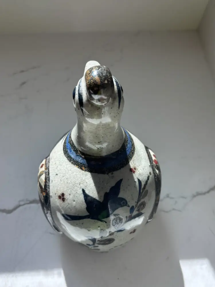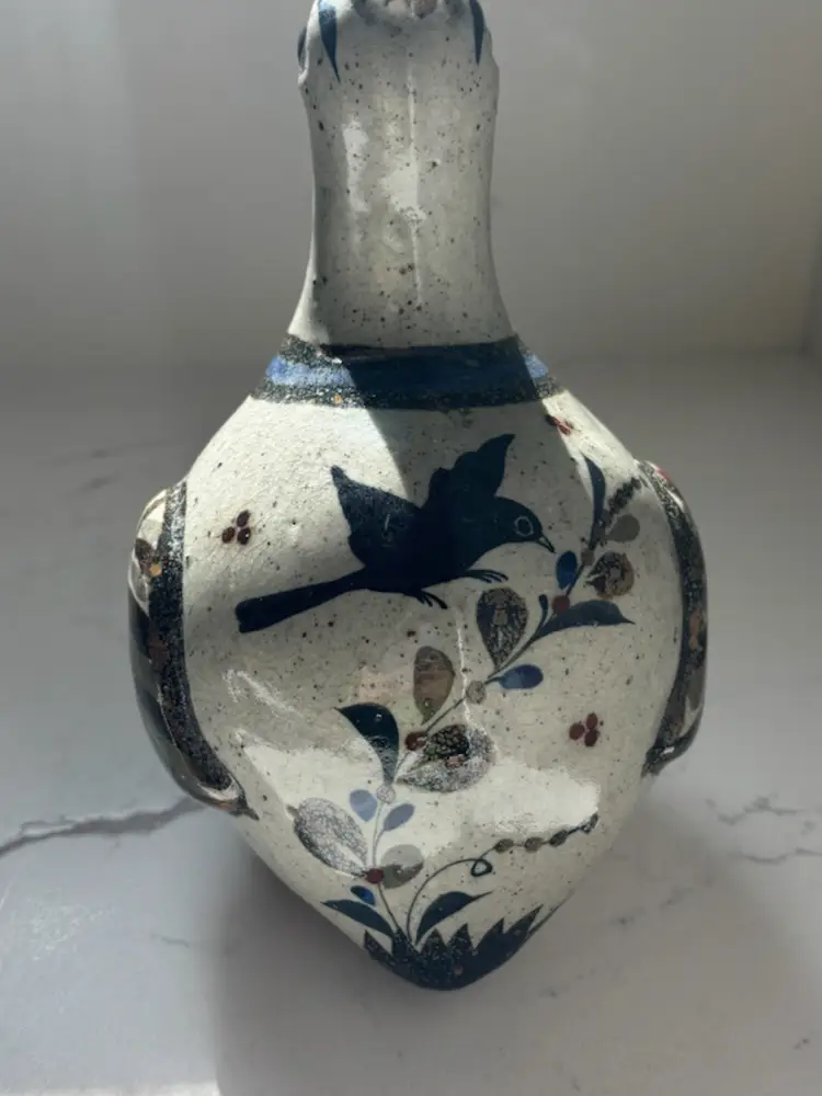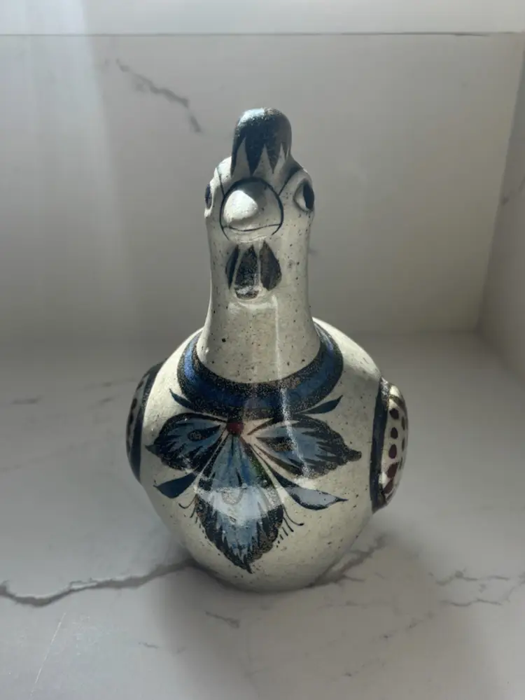 Blue and brown signed Tonala bird, maybe a quail? No chips cracks or repairs. 8” tall.