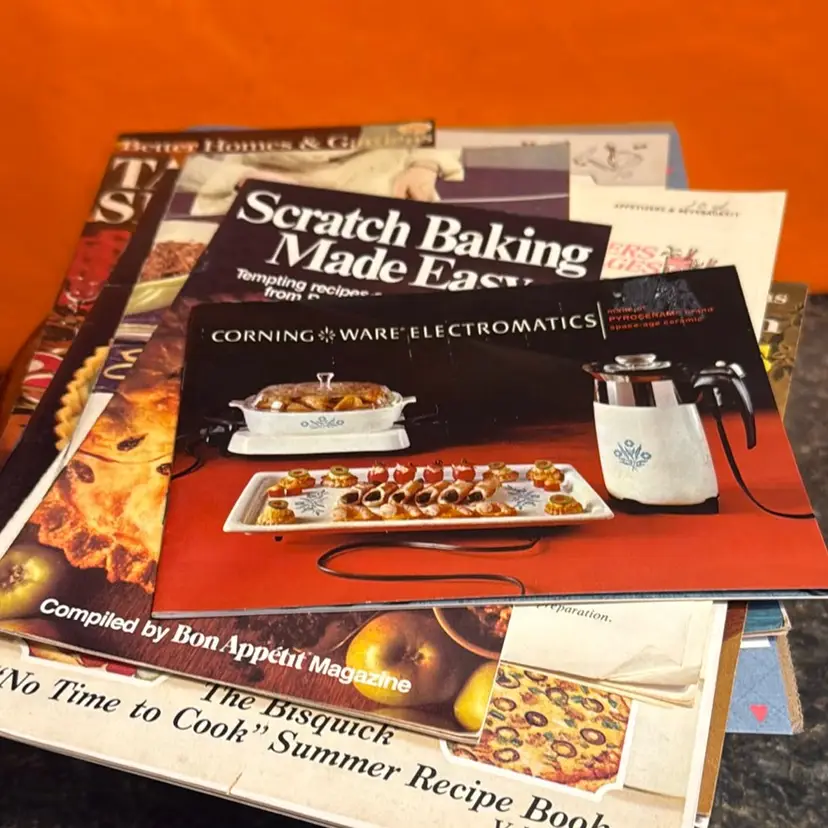 What an adorable little collection of vintage! Perfect for crafting or display or just recipe ideas! These are not in perfect condition. They are used vintage. But they are in fair condition for their age. I think you’ll love this little collection.