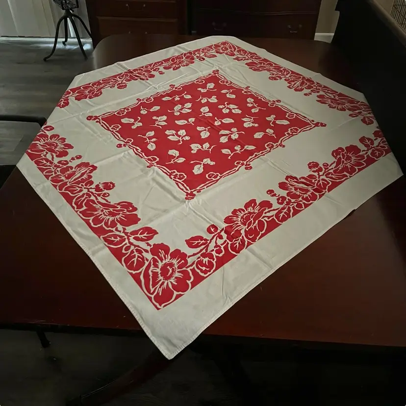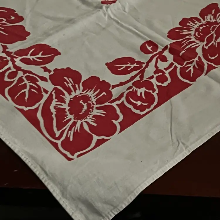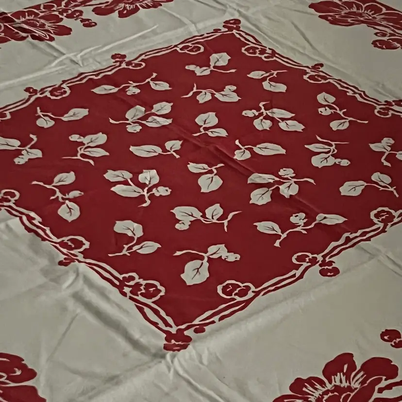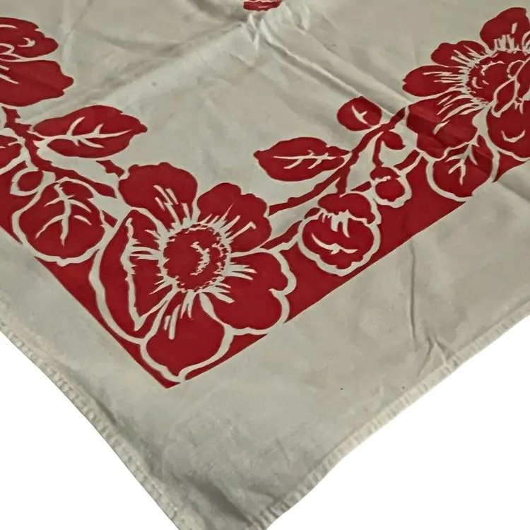 127 vintage 1950s cotton red and white floral 44" x 46" tablecloth
