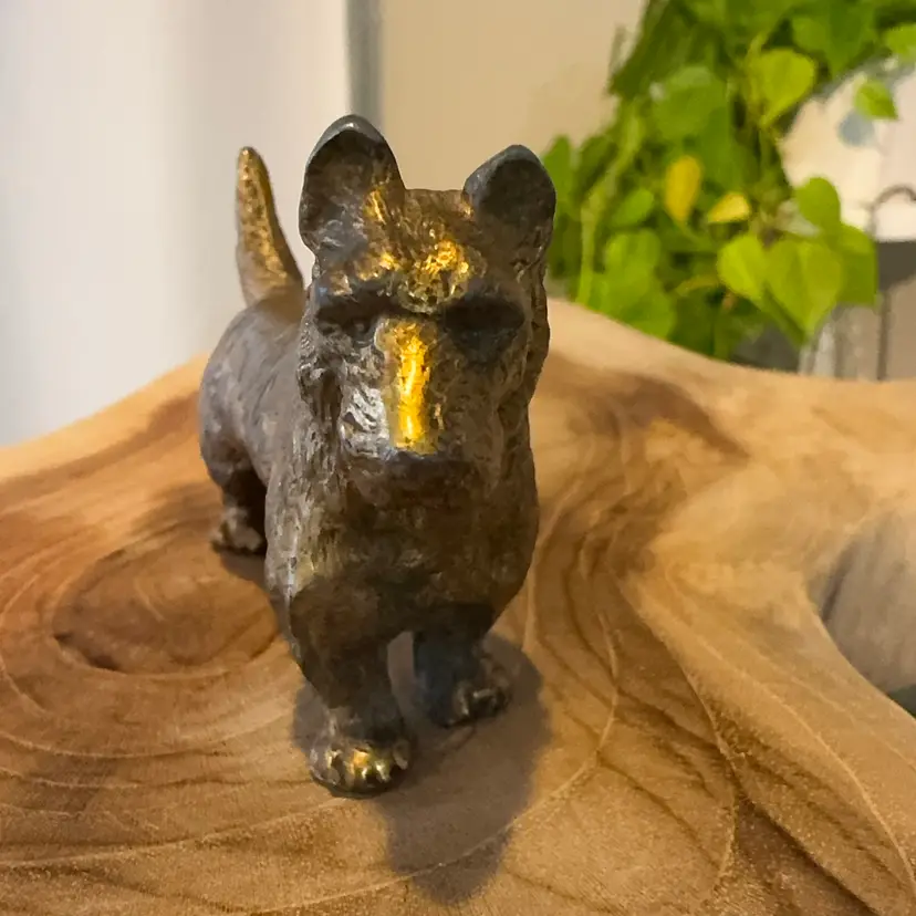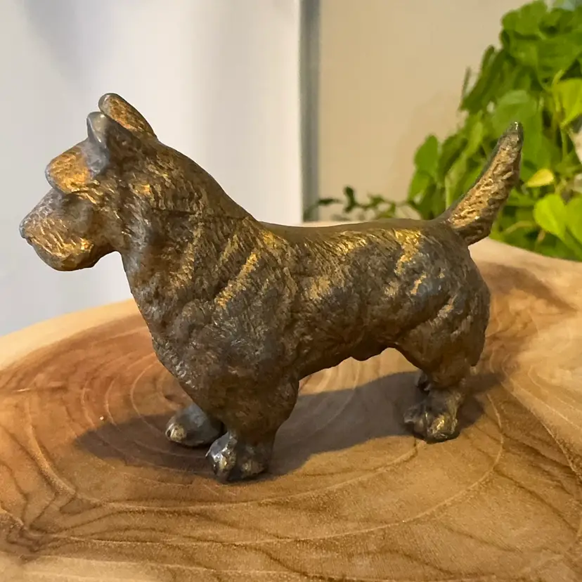 Cast metal Scottish terrier. I’m not sure if this is cast-iron or brass. Weighs a half a pound. Made in Scotland. Measures 2 inches tall in about 2 1/2 inches long.