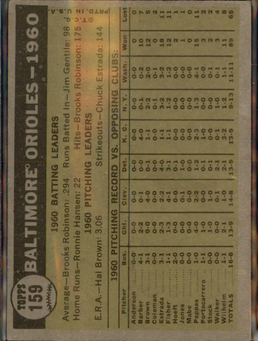 1961 Topps #159 Baltimore Orioles - (pk3) - Baltimore Orioles