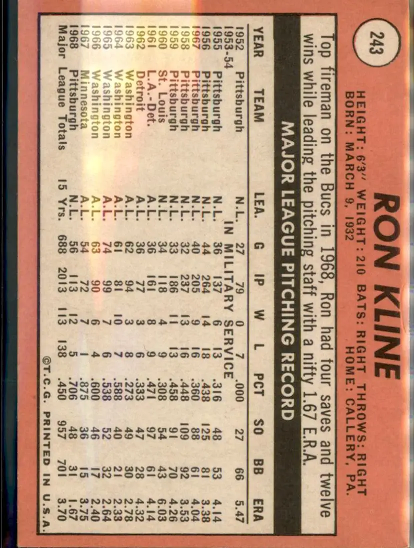 1969 Topps #243 Ron Kline - (pk3) - Pittsburgh Pirates