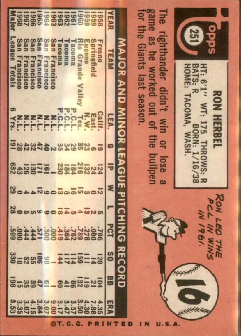 1969 Topps #251 Ron Herbel - (pk3) - San Francisco Giants