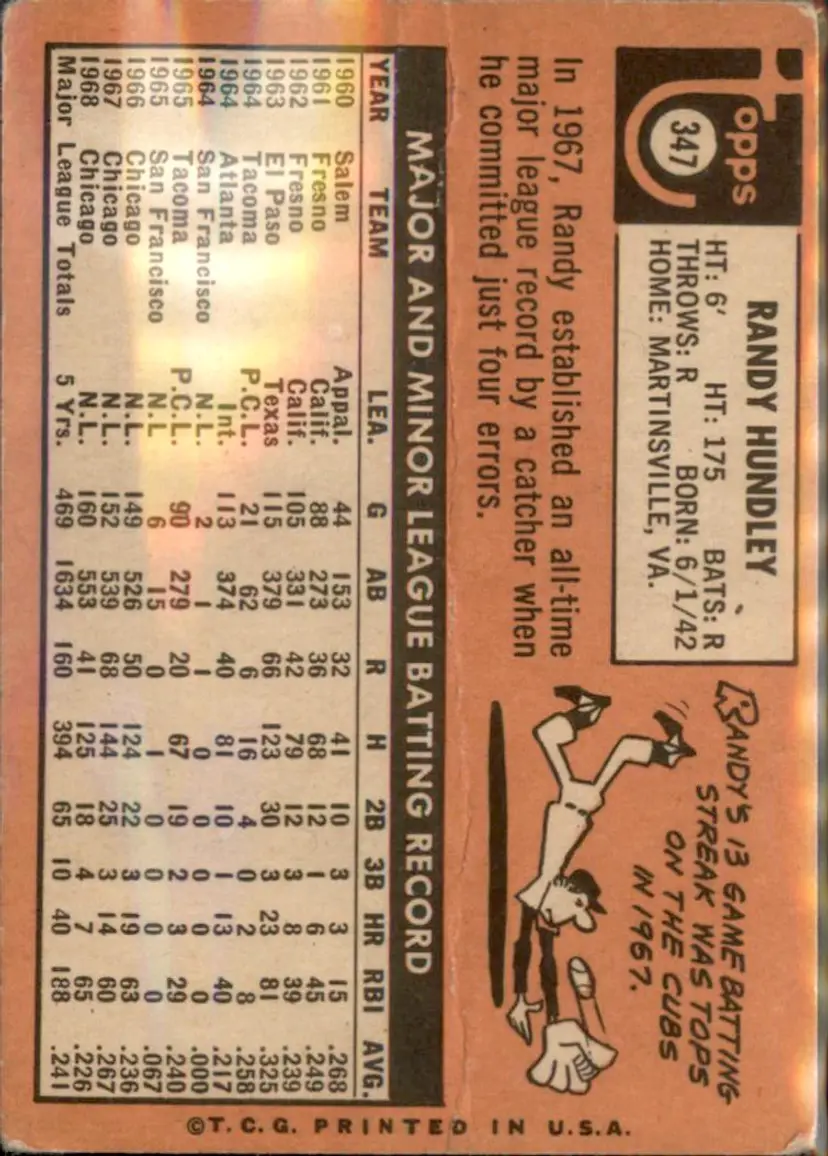 1969 Topps #347 Randy Hundley - (pk3) - Chicago Cubs