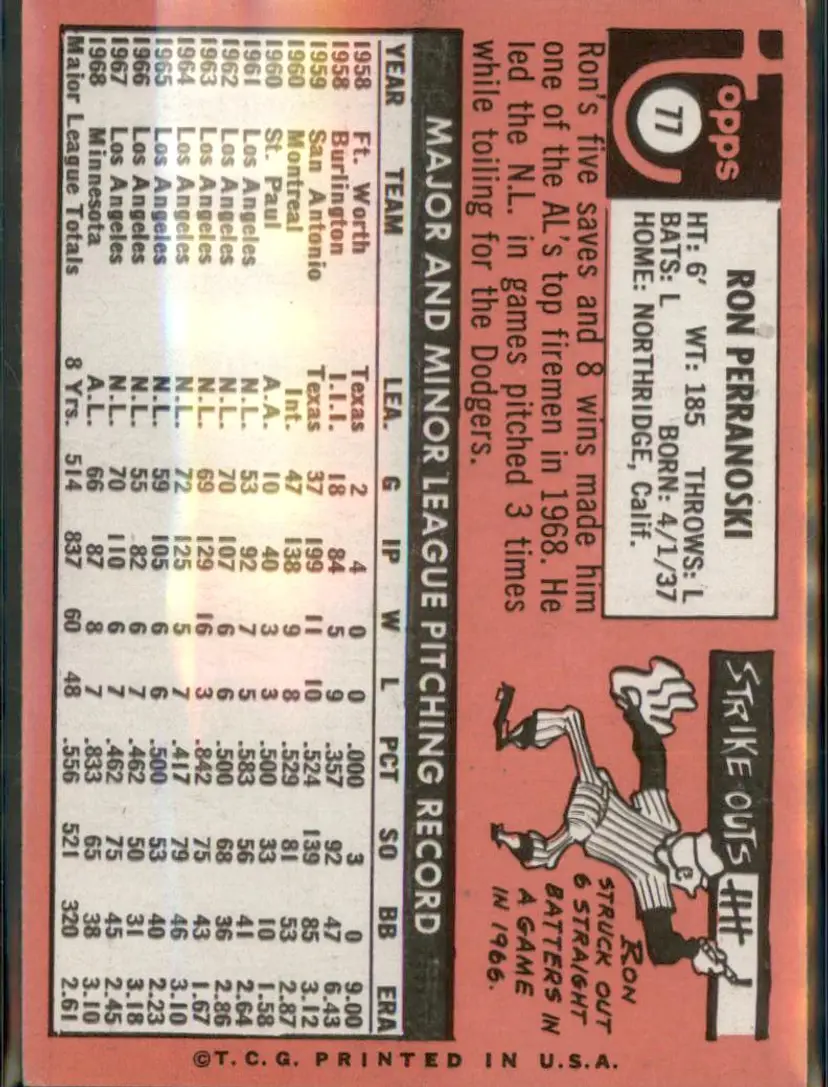 1969 Topps #77b Ron Perranoski - (pk3) - Minnesota Twins