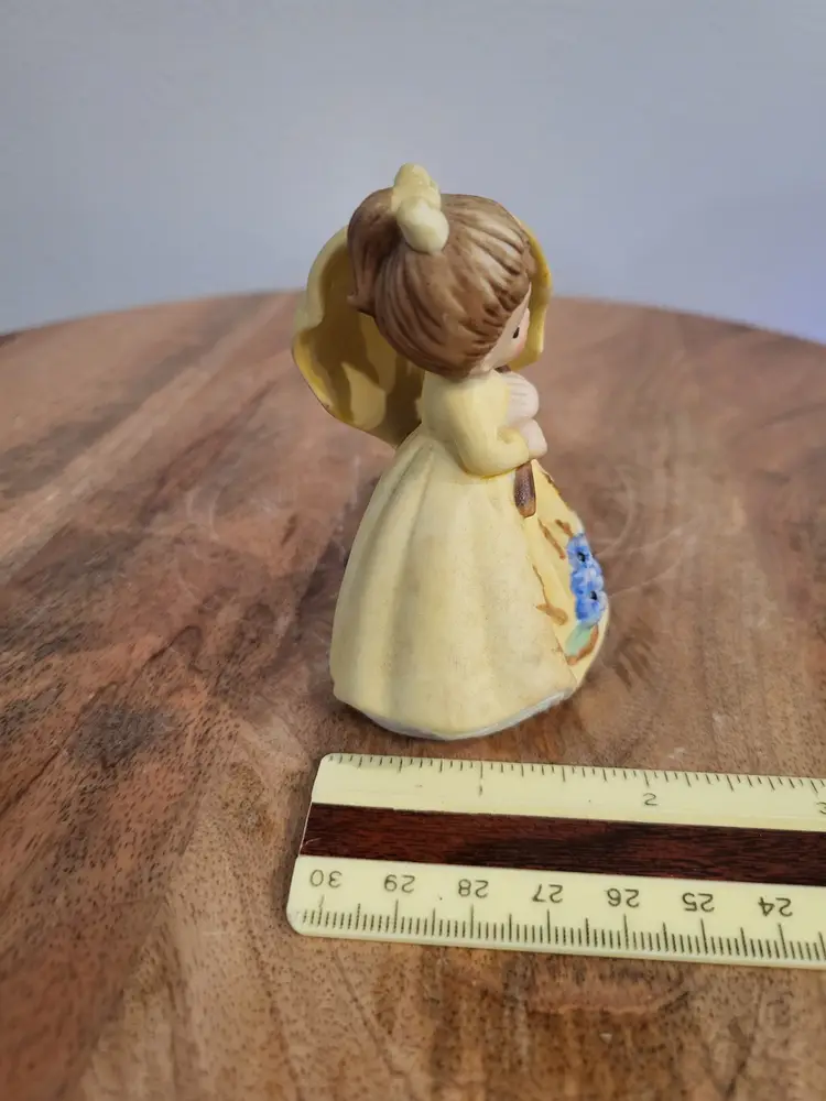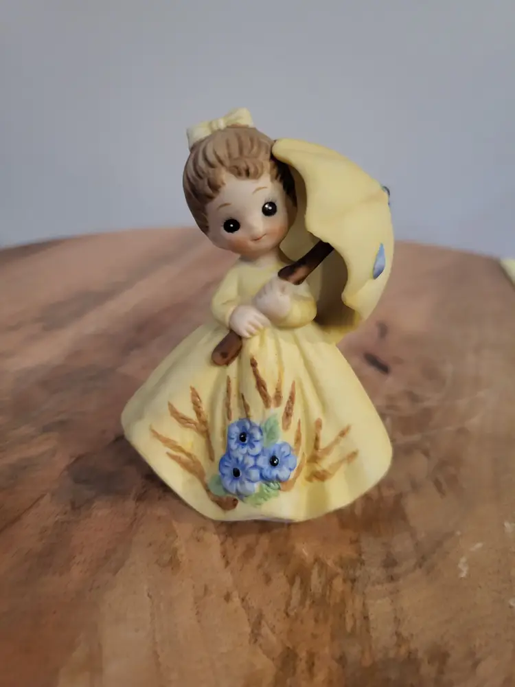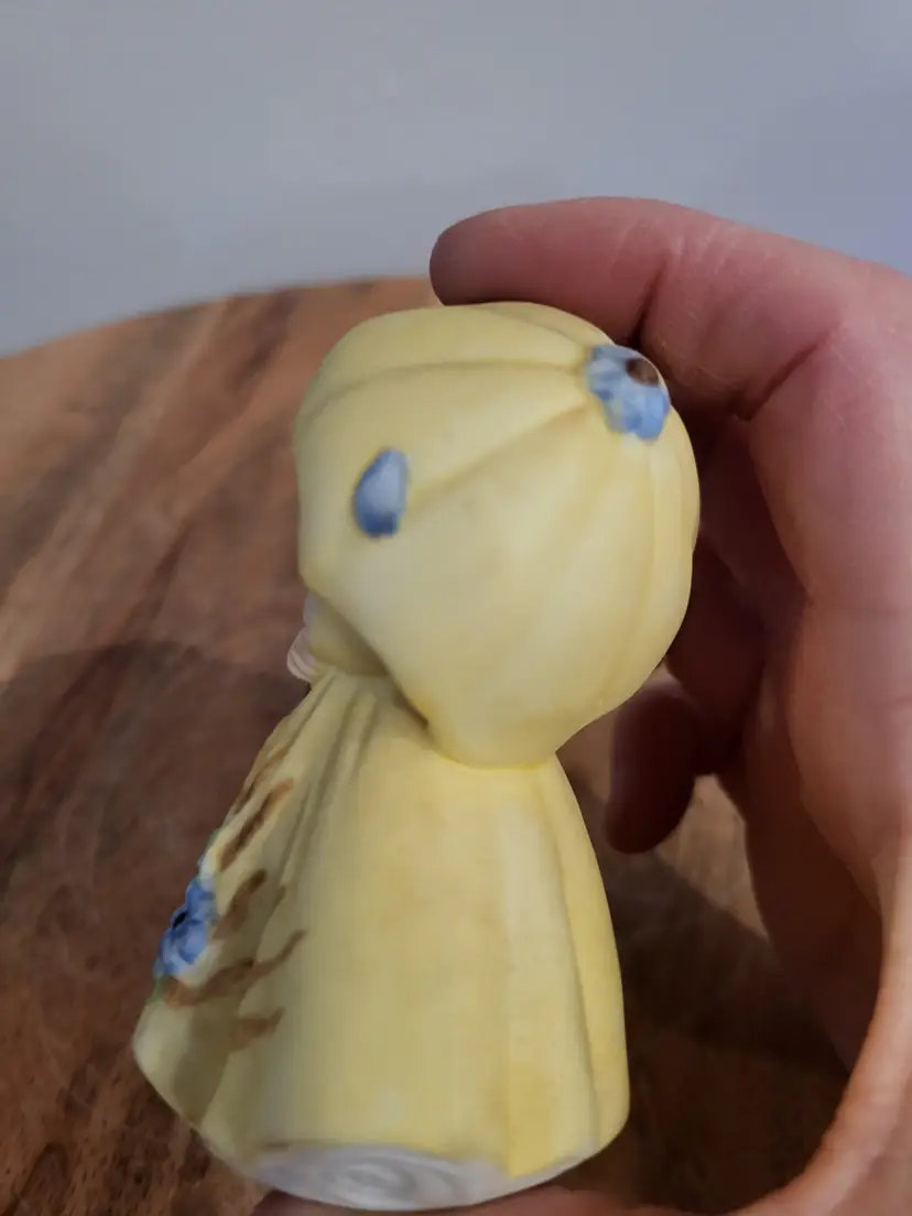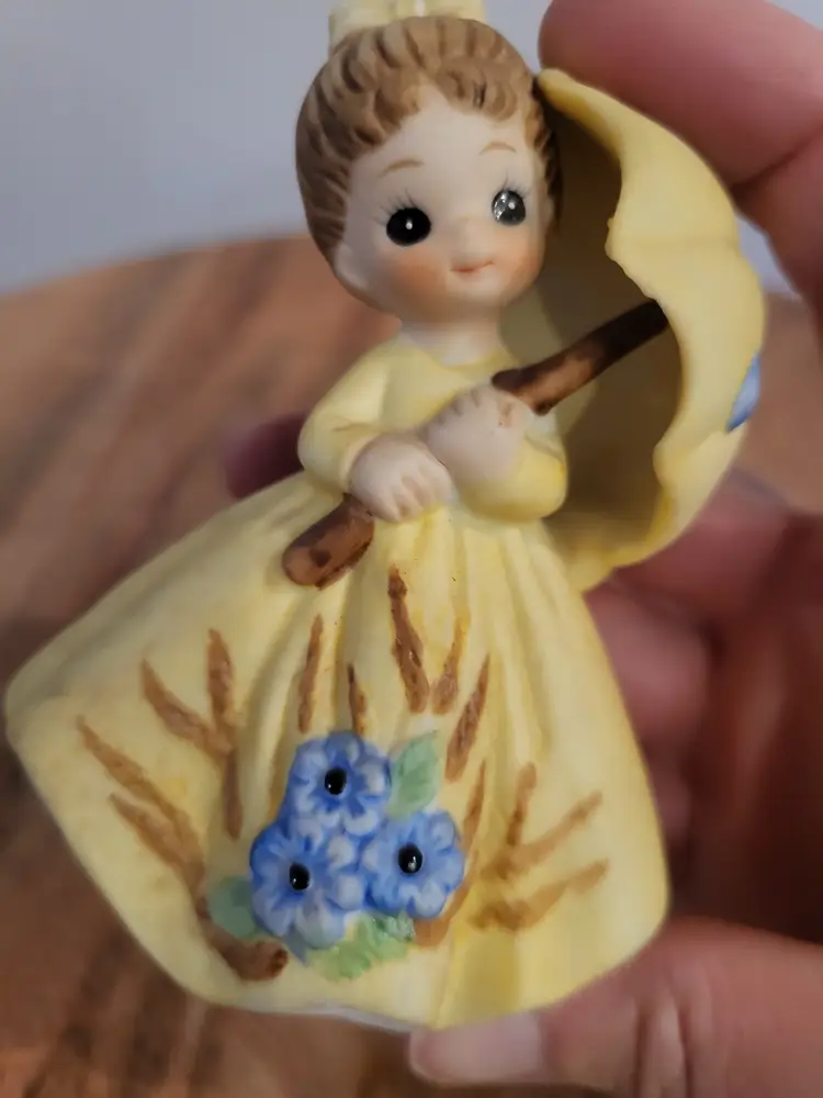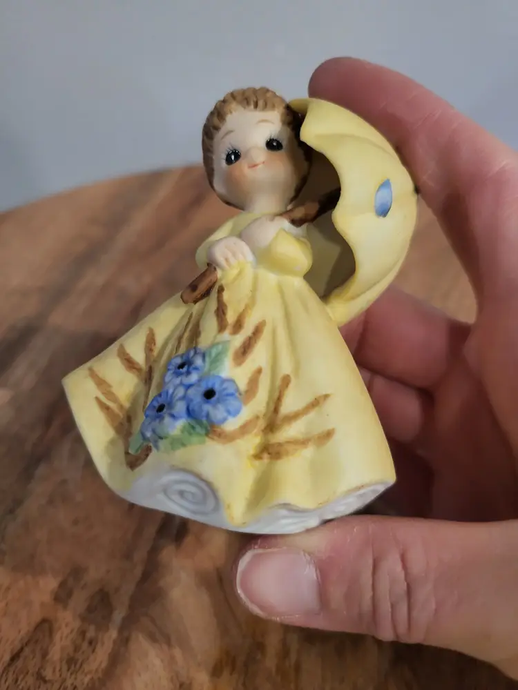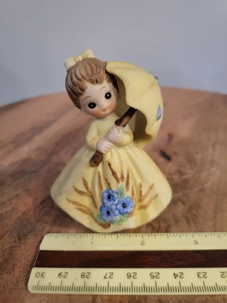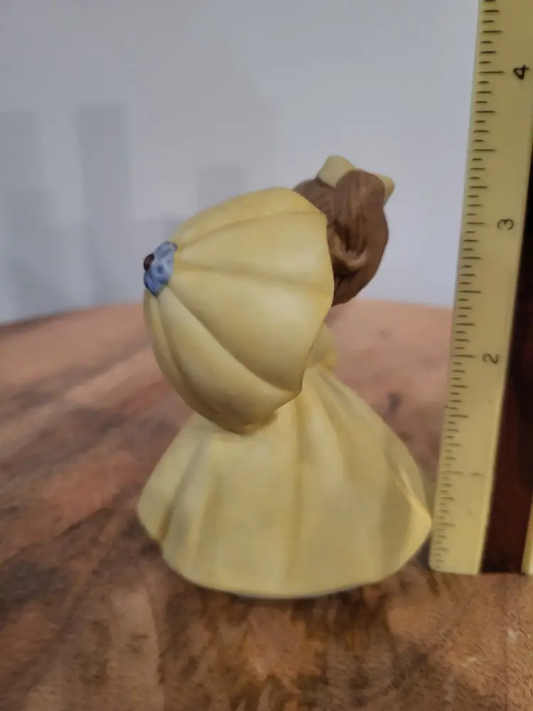 Great shape vintage figure. Yellow with blue flowers, girl holding umbrella. See pictures for measurements. Shipping cost is based on your location, size and weight of box item is shipped in.  If you feel shipping cost is to high let me know what your zip code is and I can see if there is a cheaper option.  Shipping is done by USPS, I choose cheapest option when listing but shipping will be USPS.  I do combine shipping if you buy more than one item from my store.  Any questions please do not hesitate to ask.