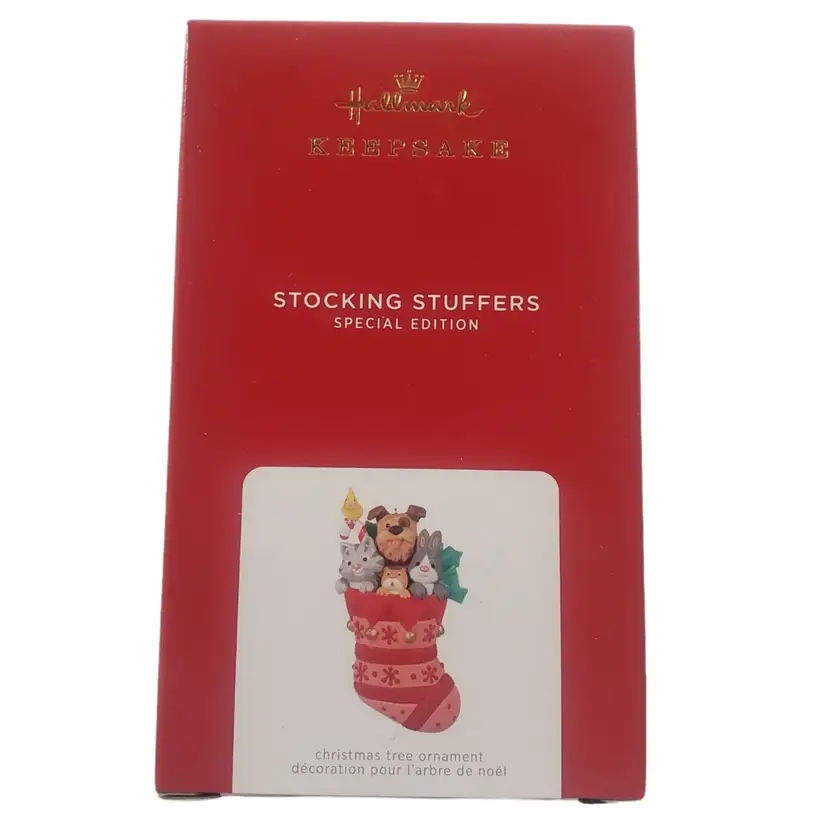 This intricately crafted Hallmark Keepsake ornament brings a whimsical charm to holiday decorations. Designed by Nina Aubé, it captures the joy and nostalgia of Christmas. Its vibrant hues and thoughtful artistry highlight the festive spirit, making it a meaningful addition to any tree. A cute vision of holiday harmony with her striped snowflake stocking that hosts beloved family pets, including a puppy, kitten, hamster, bunny rabbit, and a cockatiel perched atop a candy cane. This is a special edition REPAINT (COLORWAY), special/different colors than the #1 Series ornament, and produced in a much smaller quantity for the July Premier Event. Different colors were used on the stocking AND the animals.