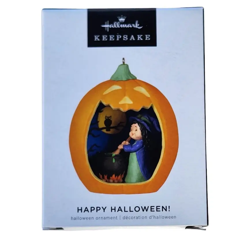 Celebrate Halloween with the Hallmark Happy Halloween! 10 Witch Keepsake Ornament. This handcrafted piece features a whimsical witch, perfect for adding a touch of magic to your seasonal decor. Ideal for collectors, it comes in original box, ready to enchant your home. Brew up some Halloween fun when you display this cute ornament! The diorama-style jack-o'-lantern design features an adorable little witch stirring her bubbling cauldron as an owl watches from his perch in front of a moonlit sky.