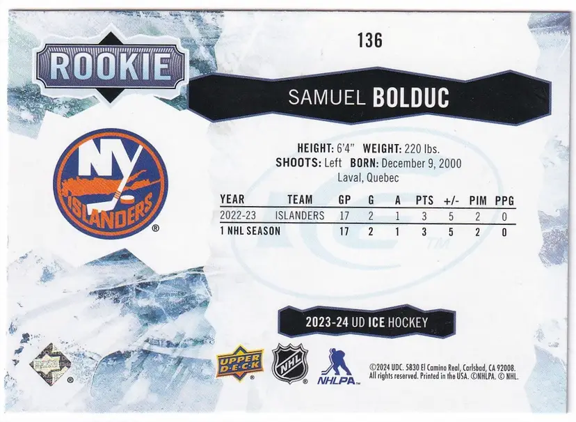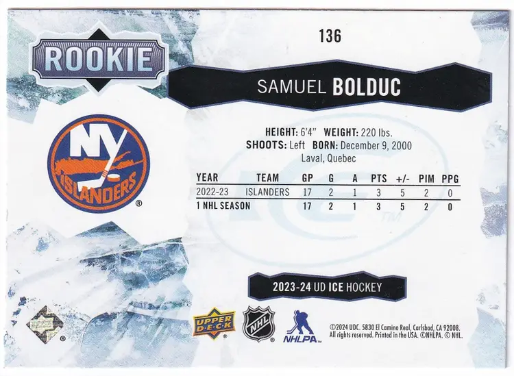 2023-24 Upper Deck Ice Green #136 Samuel Bolduc New York Islanders