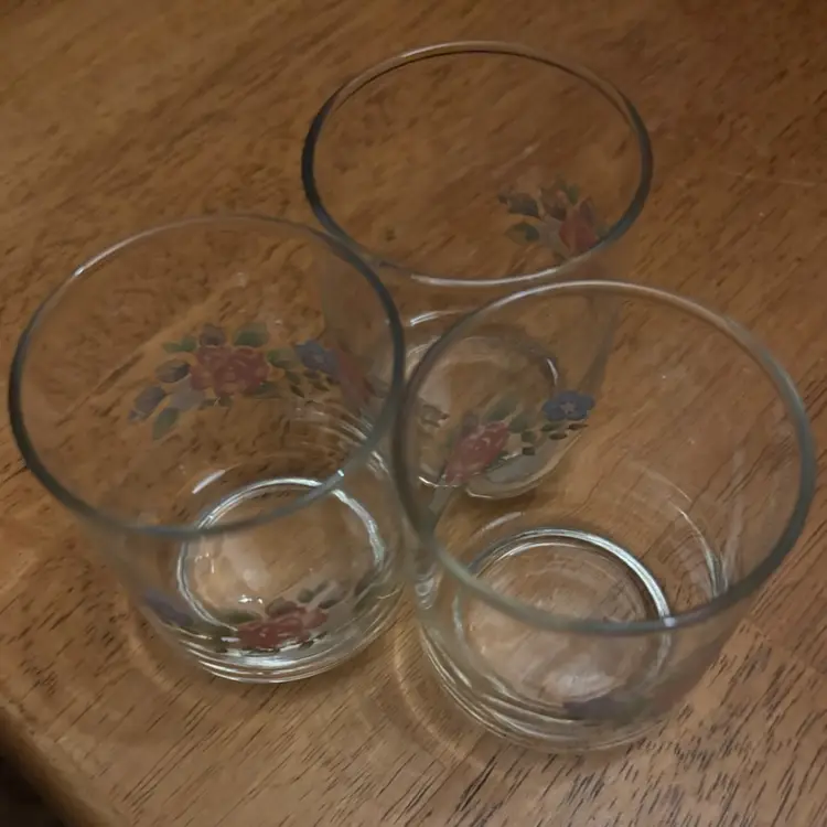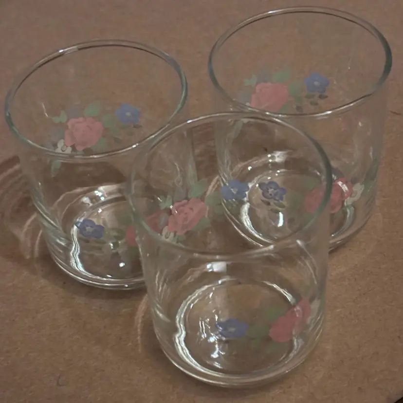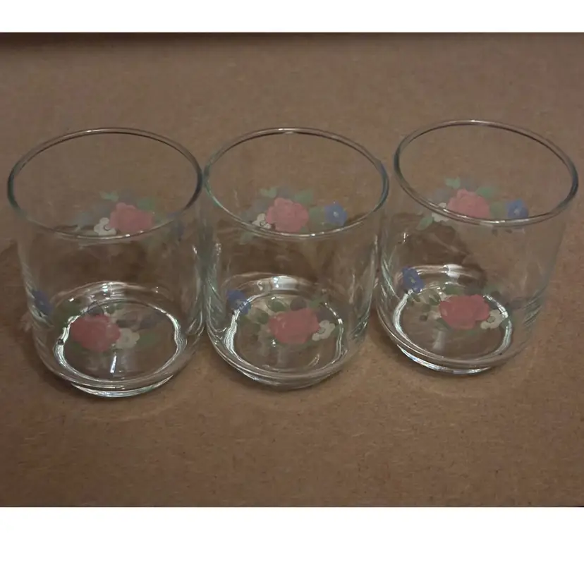 Approx. 3” and 4ozs. Vintage Pfaltzgraff juice glasses, manufactured by Libbey (Marked on bottom with the Libbey “L”)The Tea Rose pattern, features a delicate floral design with pink and blue roses and was first introduced in 1985 and is now discontinued