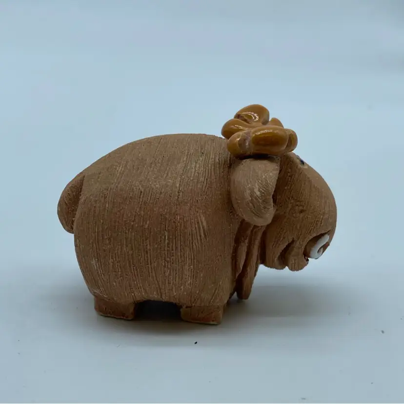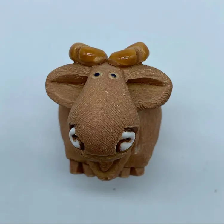 This particular moose figurine embodies the typical Rinconada style, with its simplified yet expressive features and textured finish. Figurines like these were often produced in the mid to late 20th century, making them desirable vintage collectibles. Their appeal lies in their handcrafted nature and the nostalgic charm they evoke, often associated with decorative items from the 1970s and 1980s.