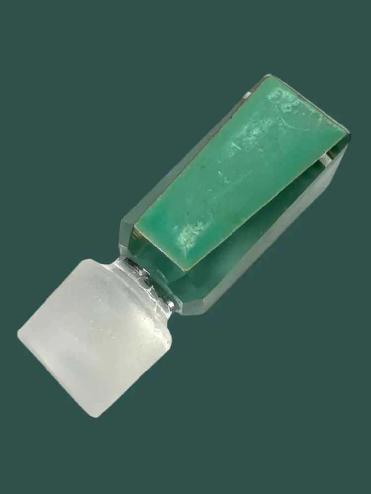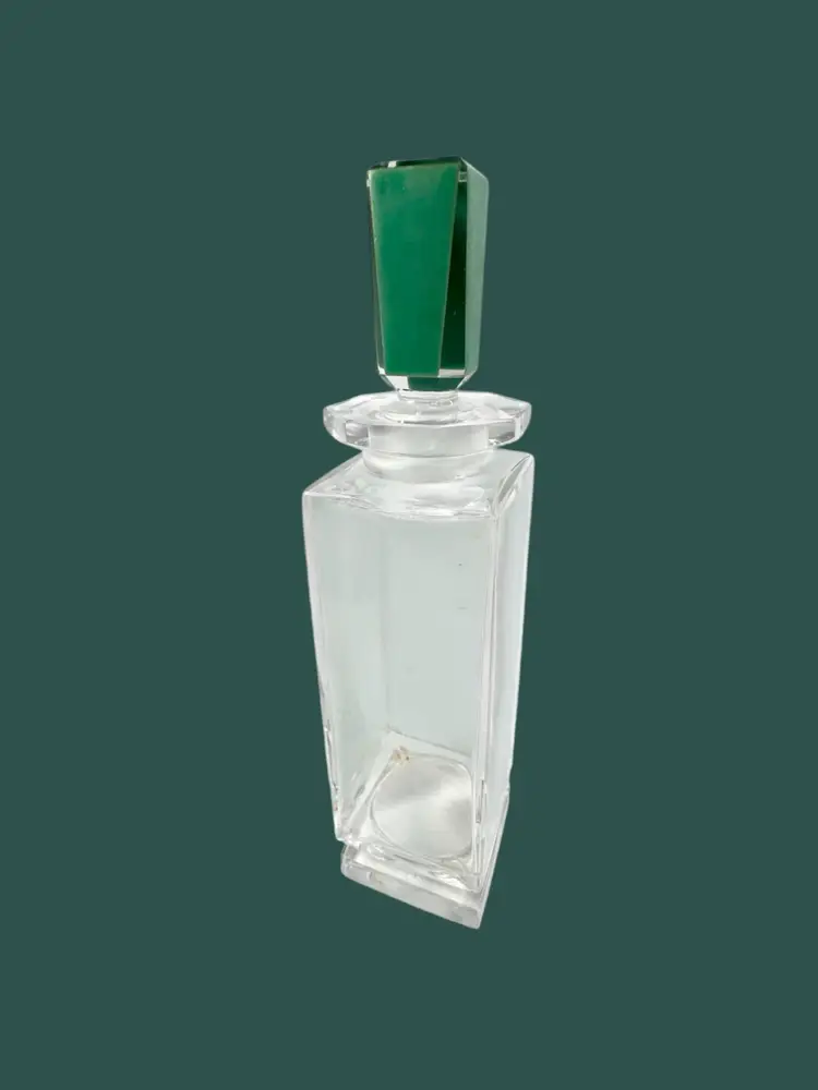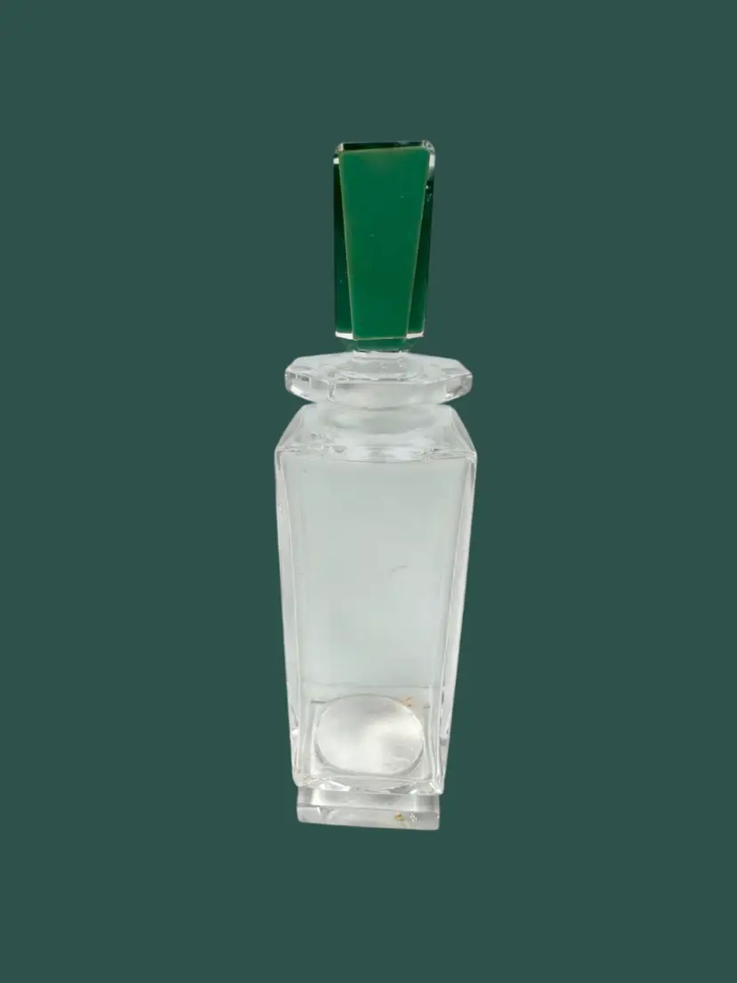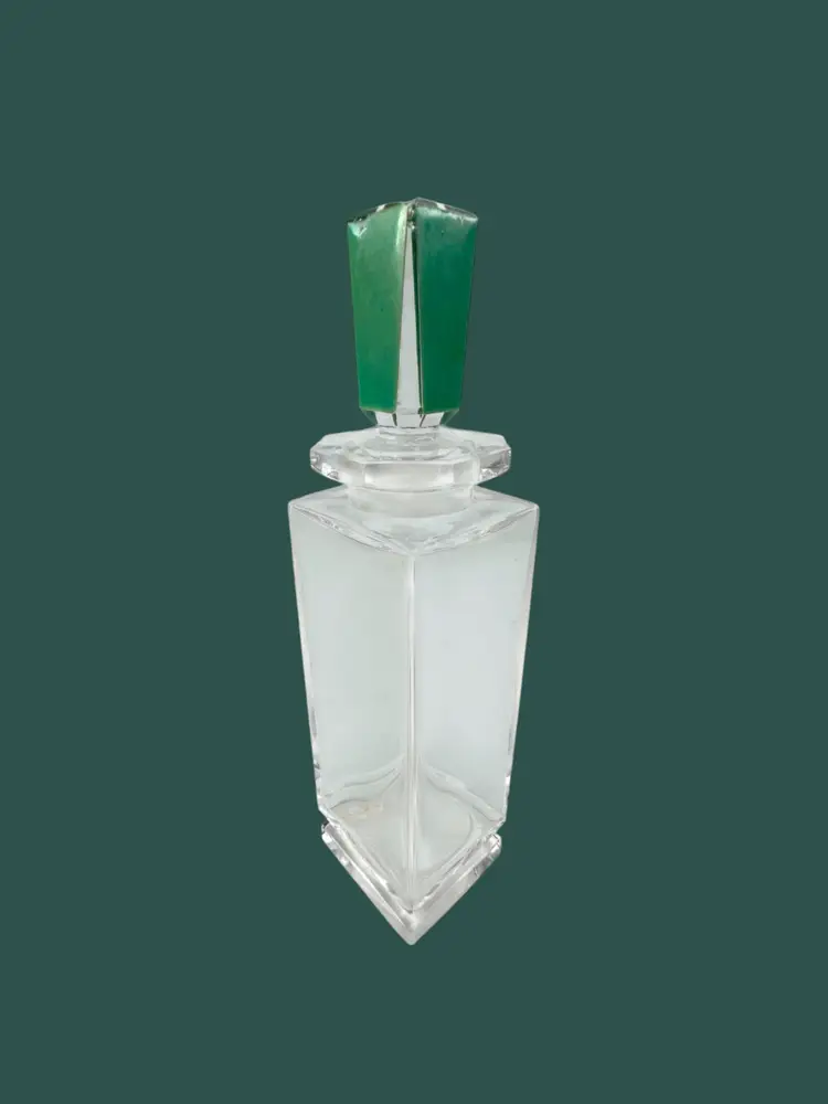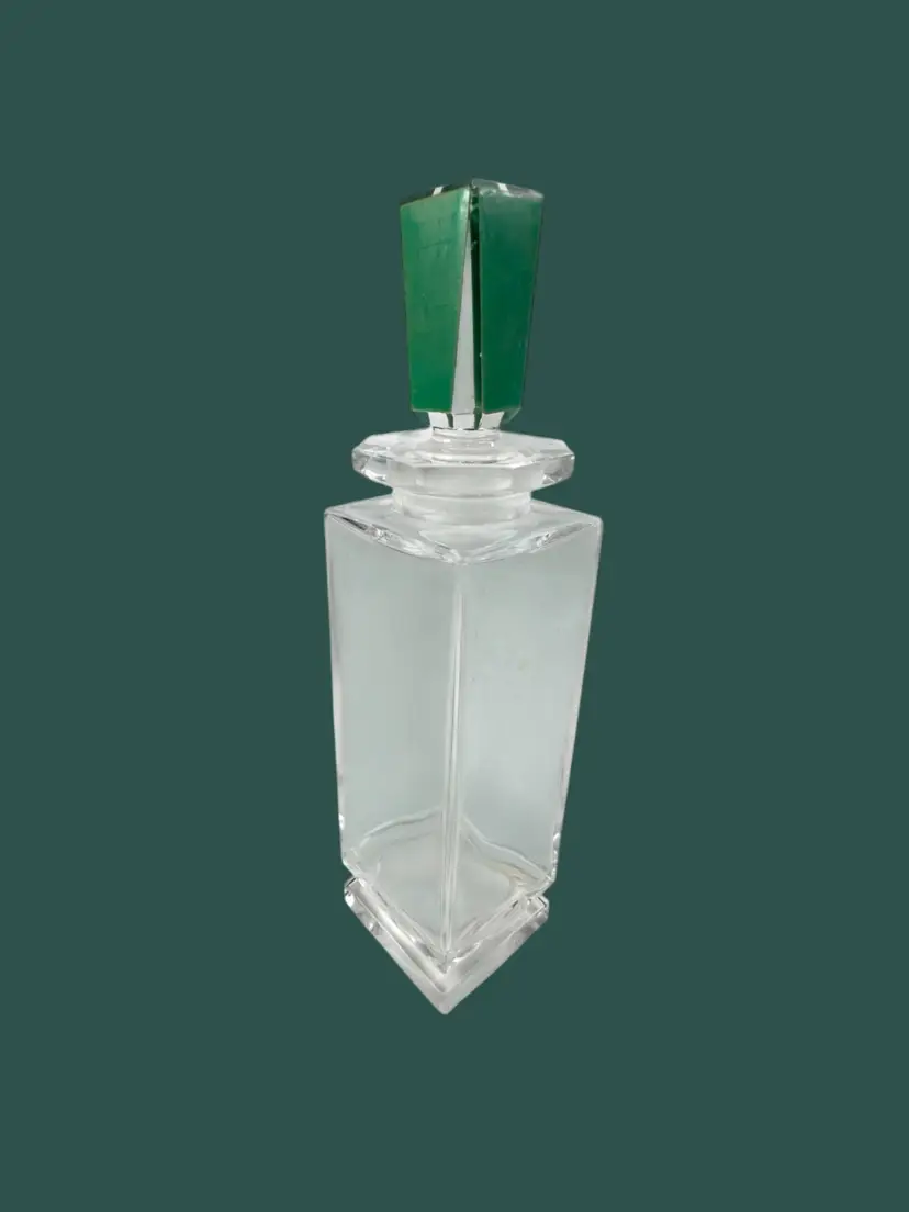 🚨Collector alert‼️ 6” Vintage c.mid-1920s French Crystal Art Deco Perfume Bottle from the House of Caron, Paris It housed their fragrance "Le Pois de Senteur de Chez Moi". Square Cut Bottle with Stopper Matching Etched Alphanumeric Code on Stopper & Bottle Bottom- A Hallmark For Baccarat Perfume Bottles Beautifully cut with a footed bottom Glows green under 365nm blacklight 5-3/4” H x 1-3/8” W x 1-3/8D Stopper 2” L Weighs 6 ounces Condition: Chip on stopper & bottle shown circled in photos. Minor scratches. Looks like a yellow area on side where a label was placed a long time ago.
