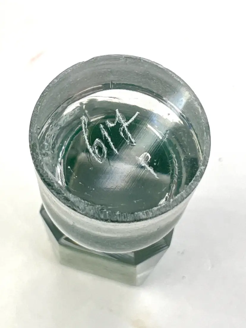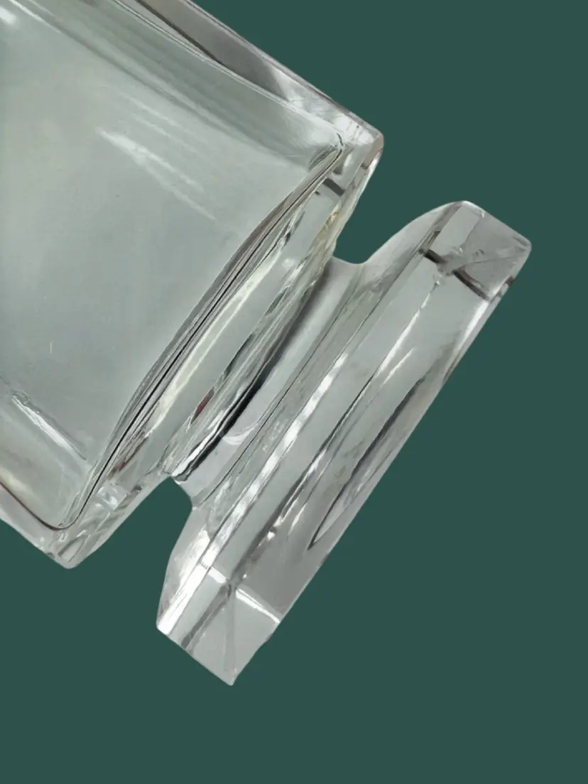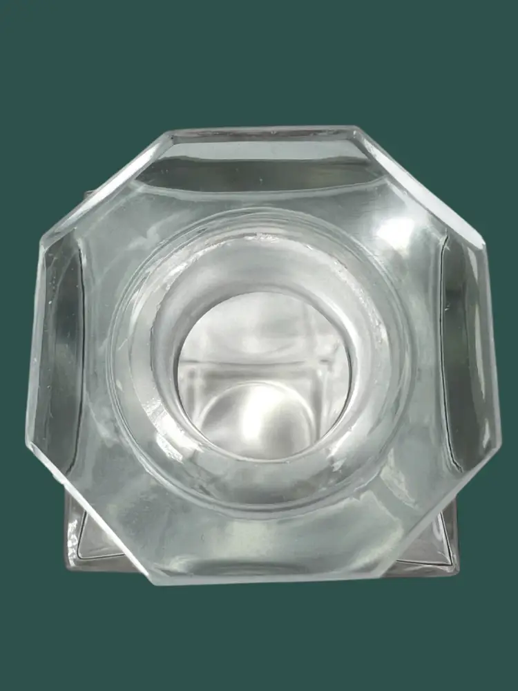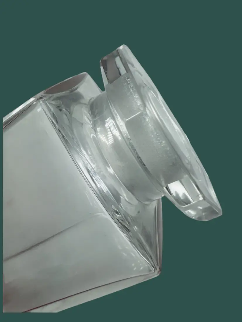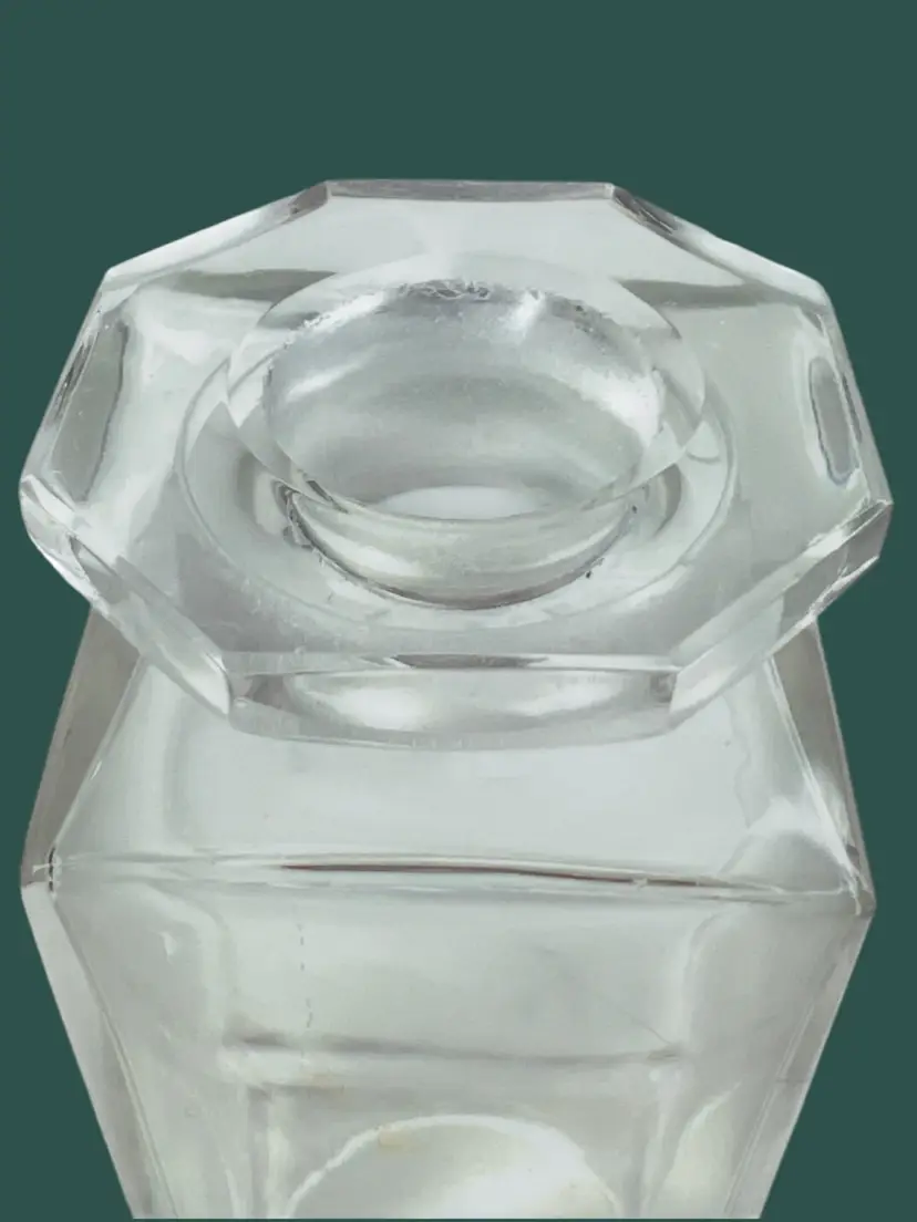 6” Vintage French Crystal Art Deco House Of Caron Perfume Bottle. Glows Green under UV! Square Cut Bottle with Stopper. Matching Etched Alphanumeric Code on Stopper & Bottle Bottom- A Hallmark For Baccarat Perfume Bottles