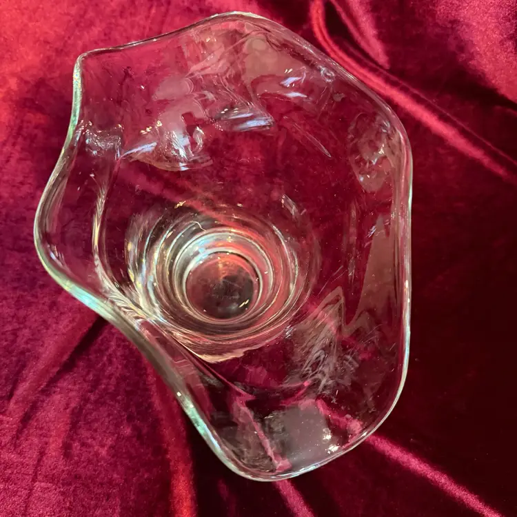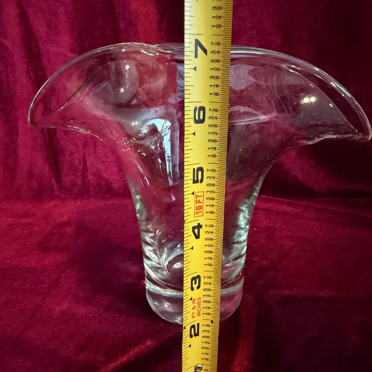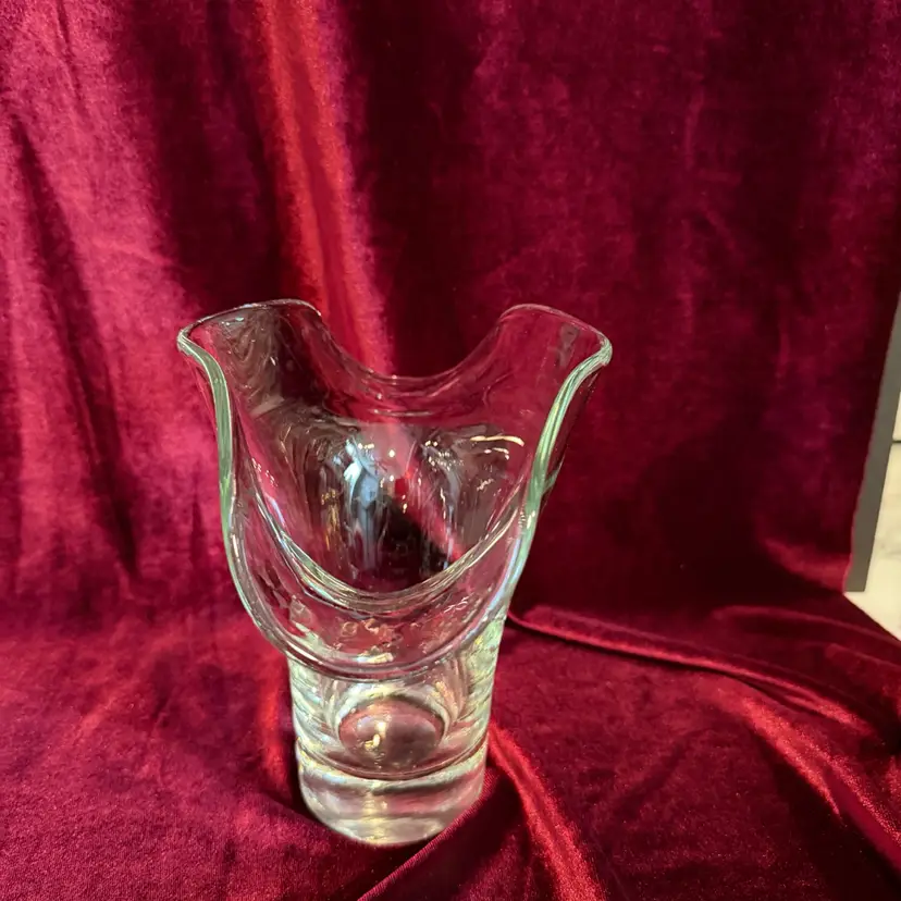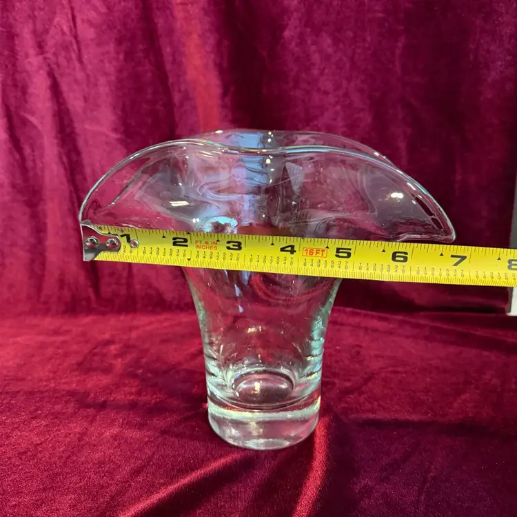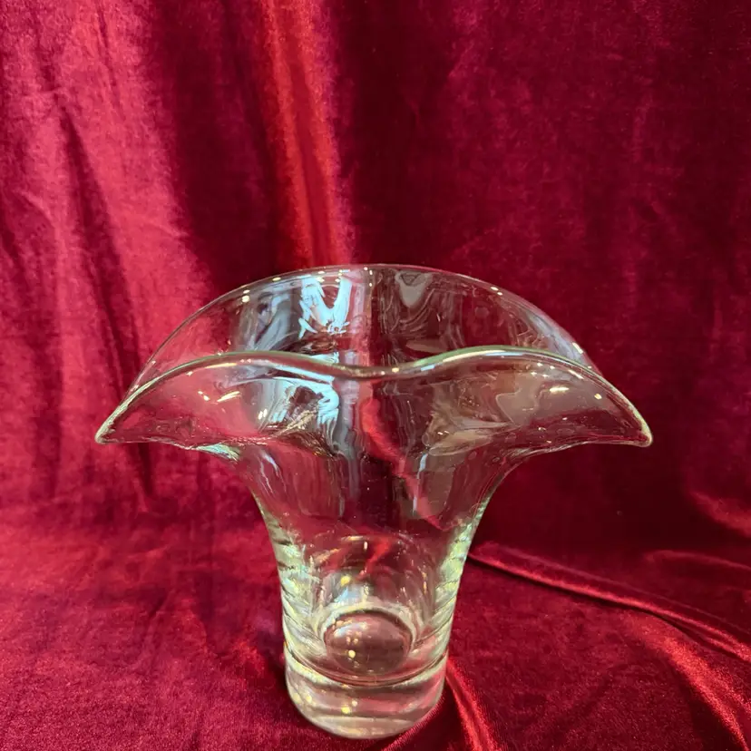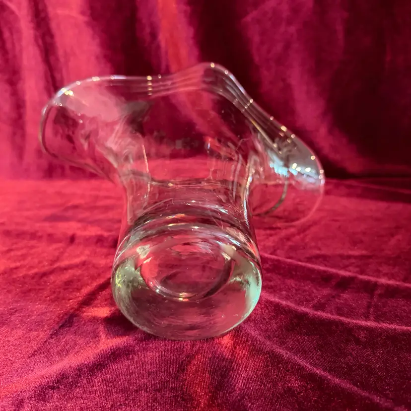 A Beautiful Vintage, clear, hand-blown glass handkerchief vase. 7” Tall 8” Wide.