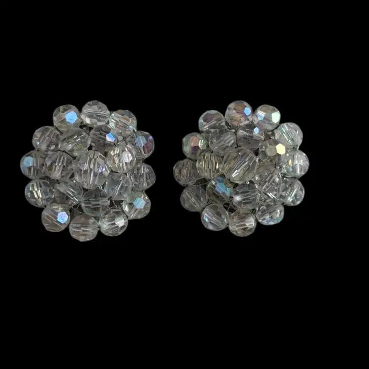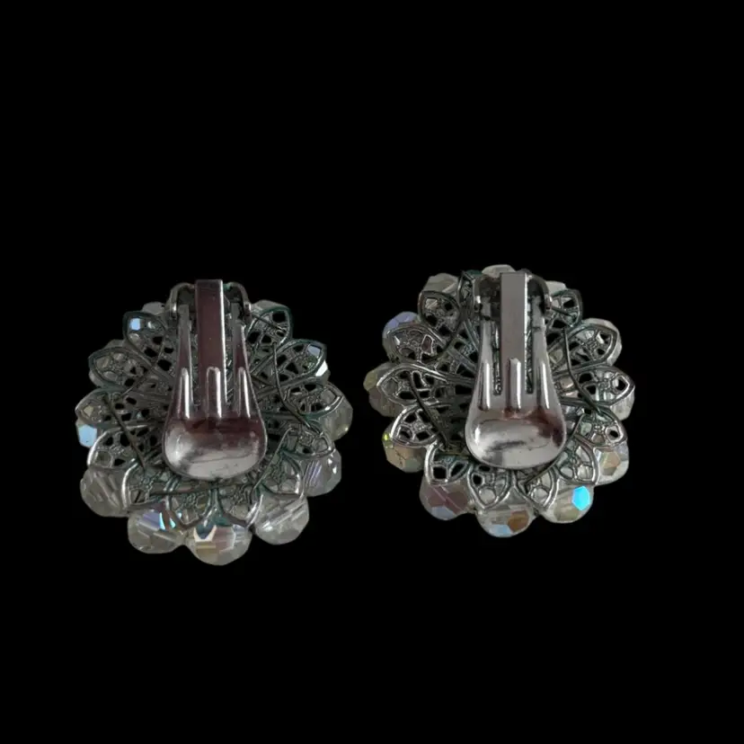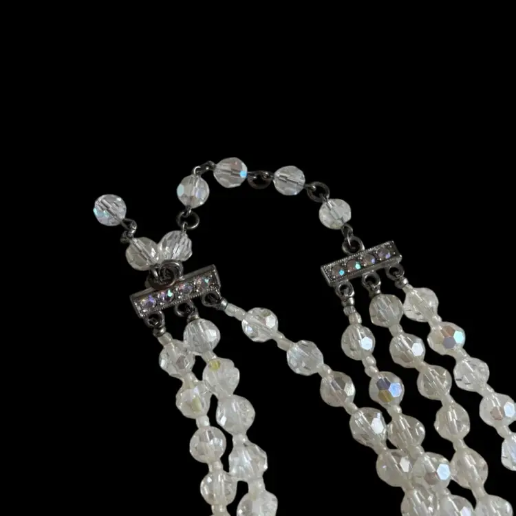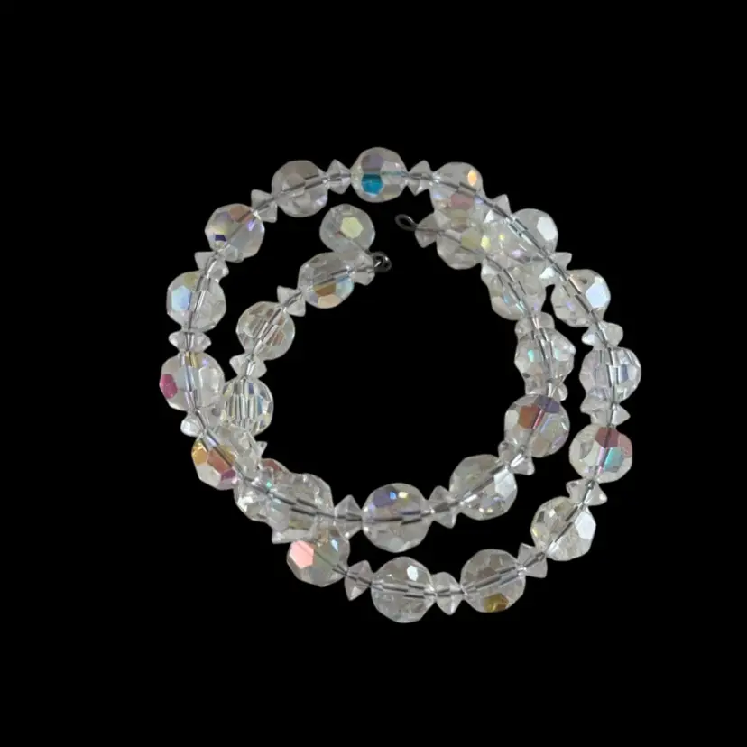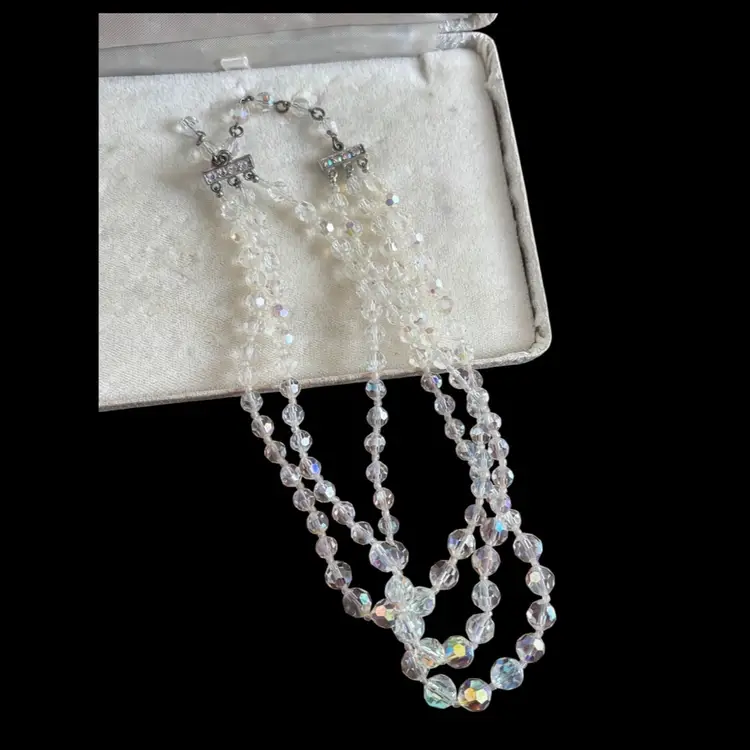 Beautiful AB Crystal jewelry set. In good condition, hint of verdigris to back or earrings. Earrings: 1” Necklace: longer strand 13”, 3” extender Bracelet: 2.25” opening, but is on wire so could expand as needed.