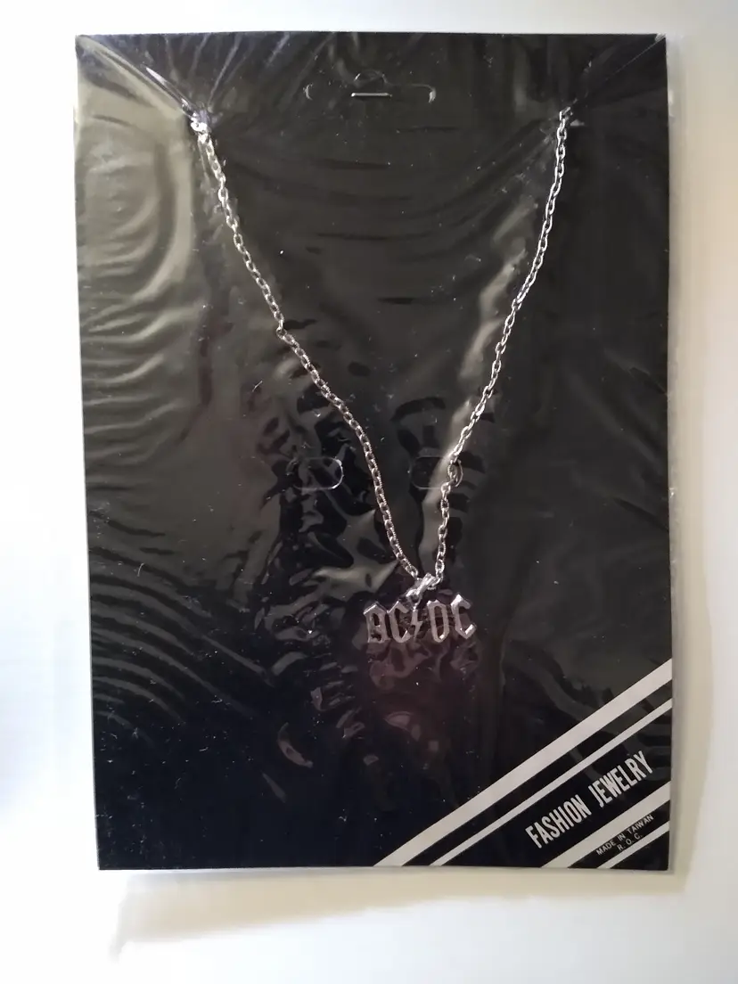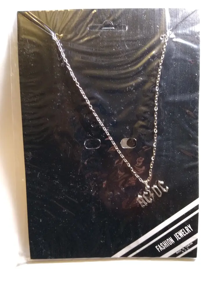 Brand/Maker: AC/DC (logo), Unbranded (jewelry manufacturer) Item Type: Necklace, Fashion Jewelry, Apparel Era/Style: Modern (based on general retail appearance) Material: Metal (silver-tone) Specifications: Silver-tone color Features: AC/DC band logo pendant Included Components: Necklace with pendant, Original carded blister packaging Country of Origin: Taiwan R.O.C.