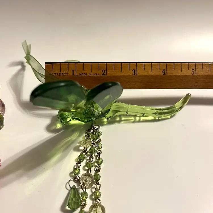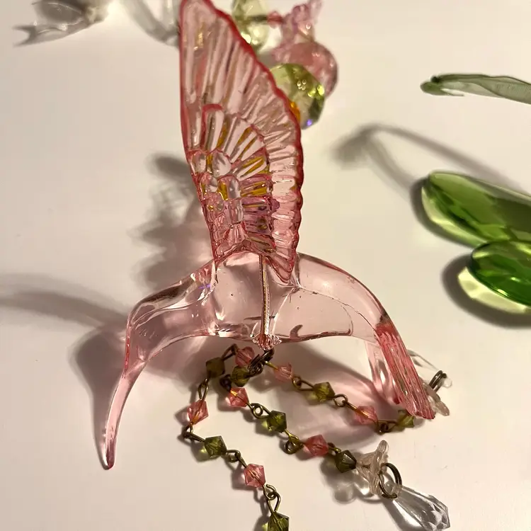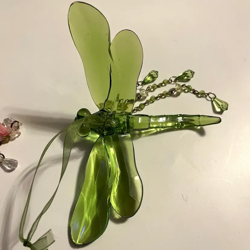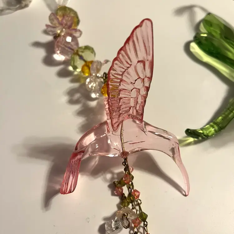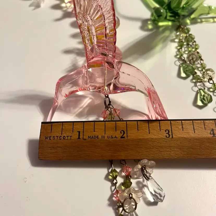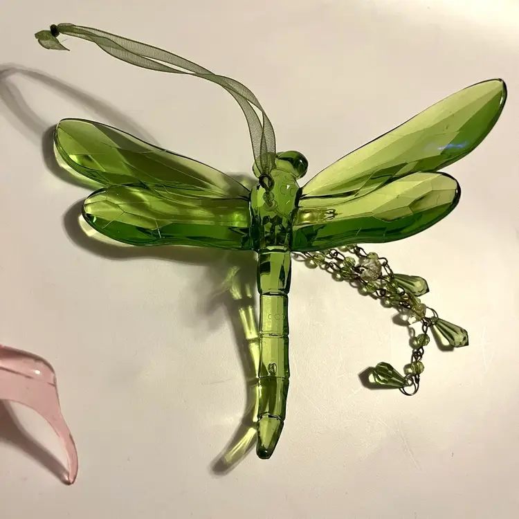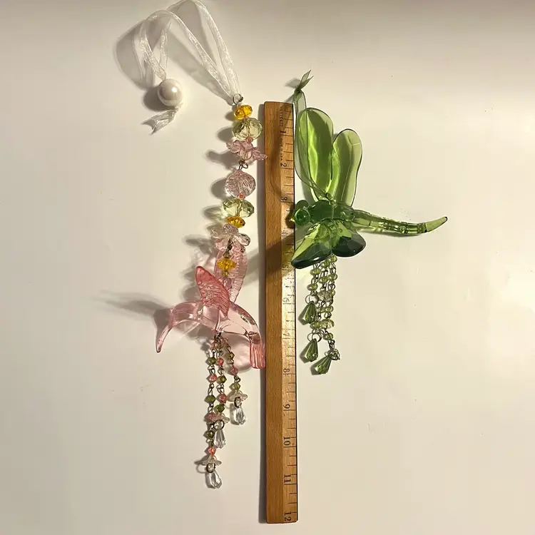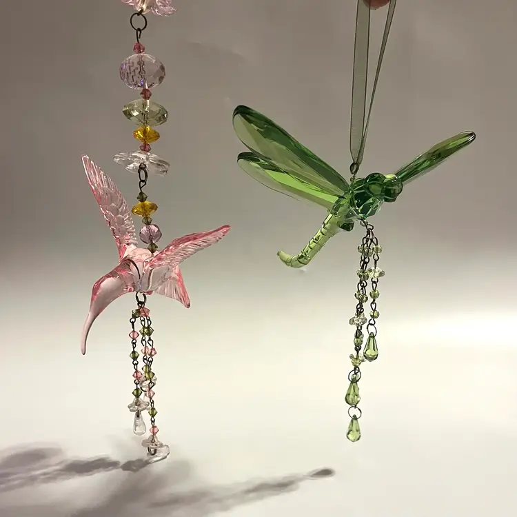 This lovely pair of acrylic suncatcher ornaments features a dragonfly and hummingbird, each crafted with clear acrylic that catches and reflects the light beautifully. Both pieces are accented with beaded strands and ribbon hangers, giving them a delicate, sparkling presence whether displayed in a sunny window or in any room.