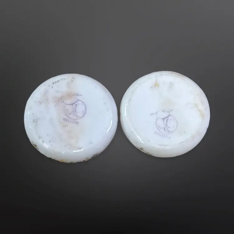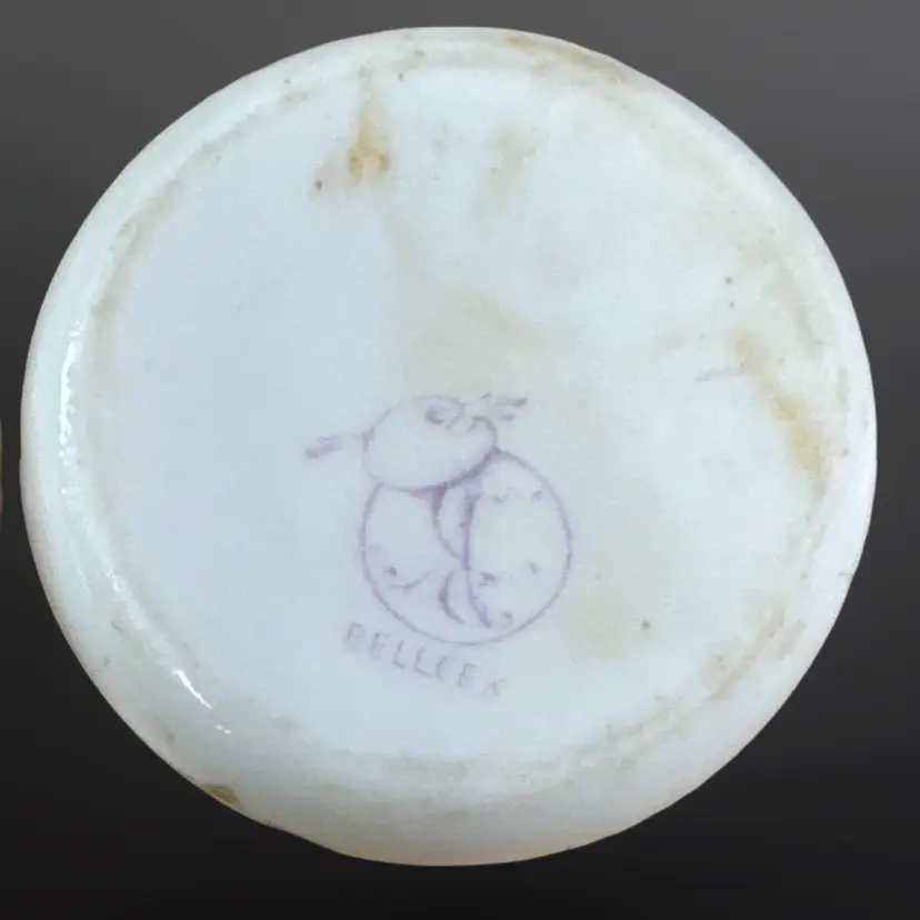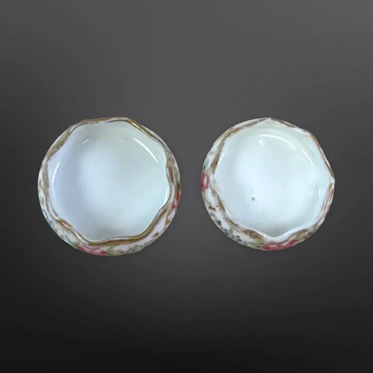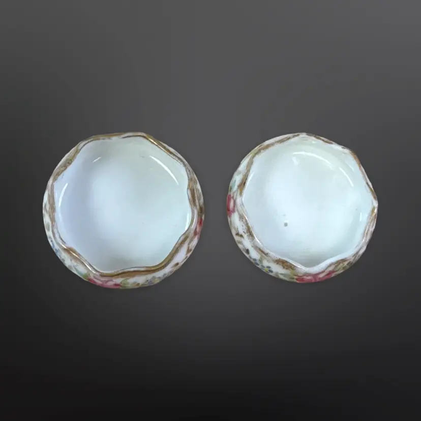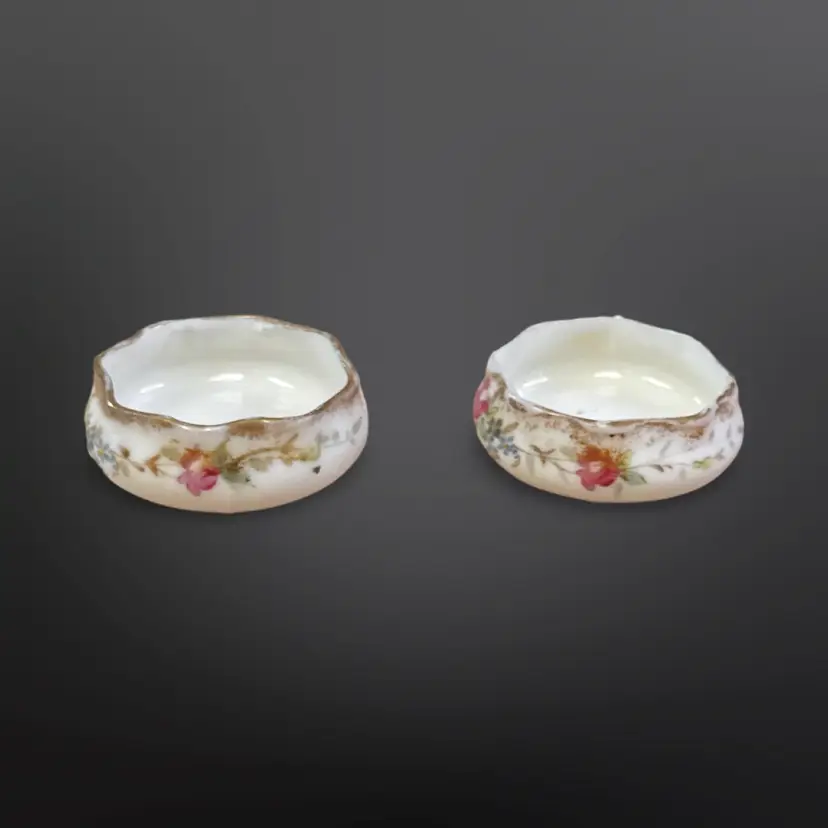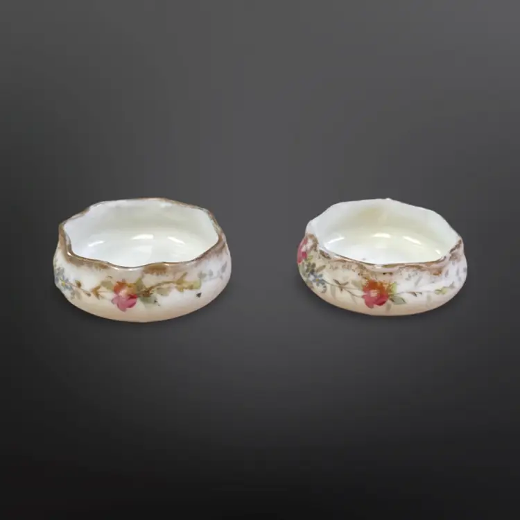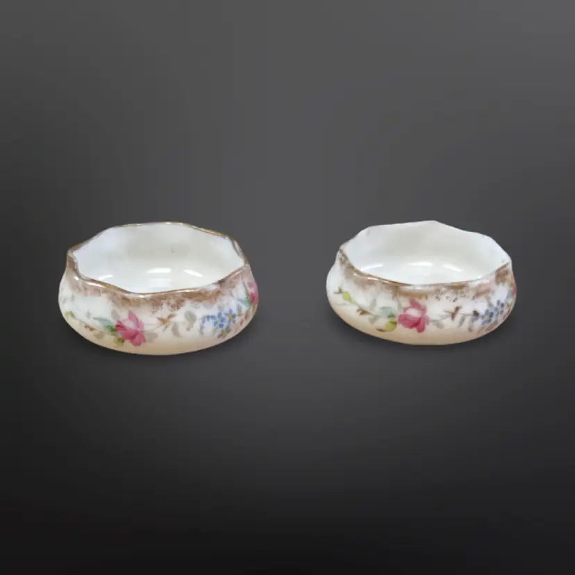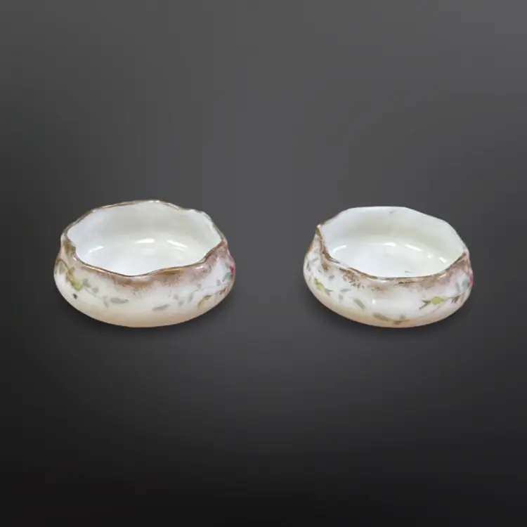 Beautiful pair of antique American Belleek hand painted porcelain salt cellars by Ceramic Arts Company between 1889-1926. November chips or cracks; some wear to the gold. Measures approximately 1.5” W x .5” H