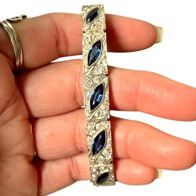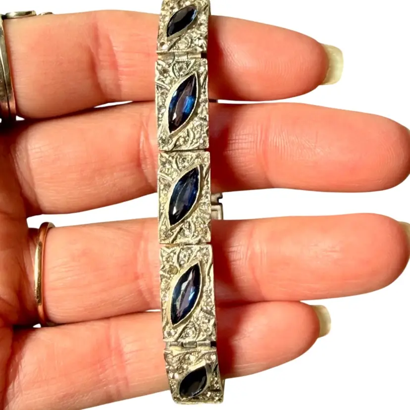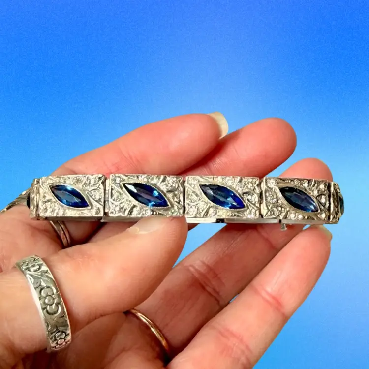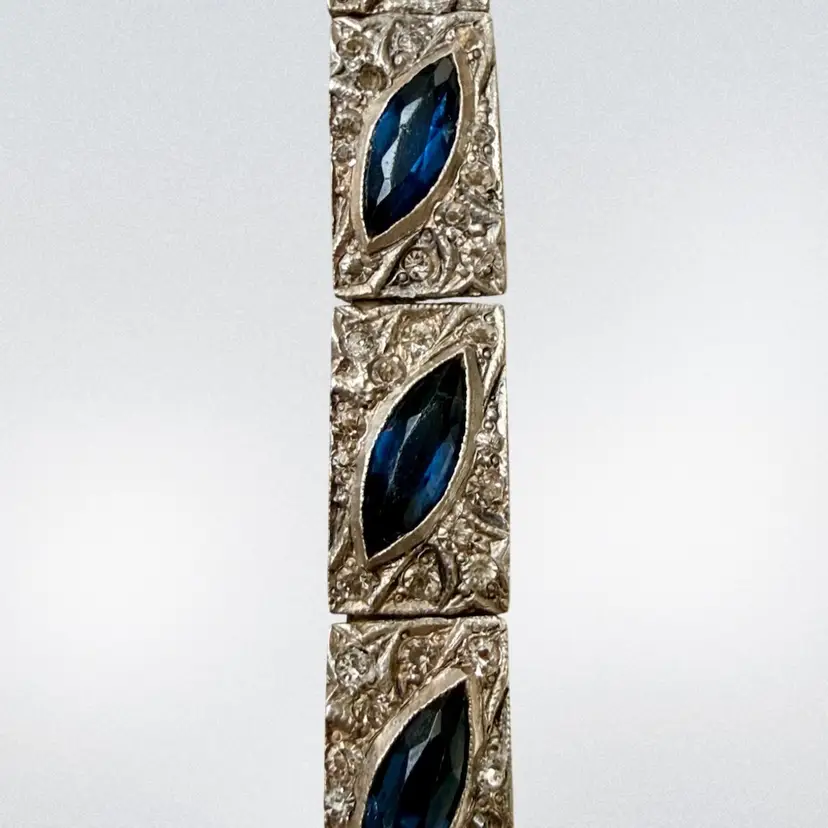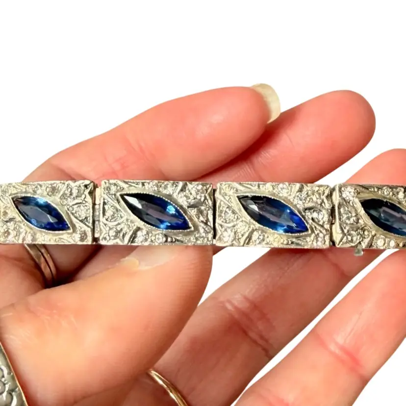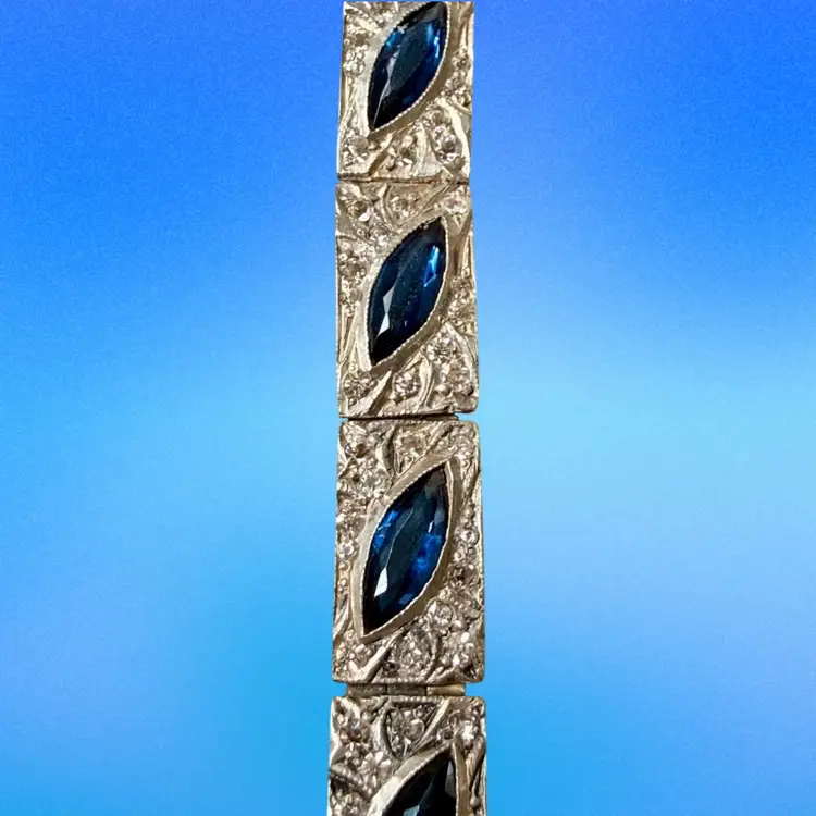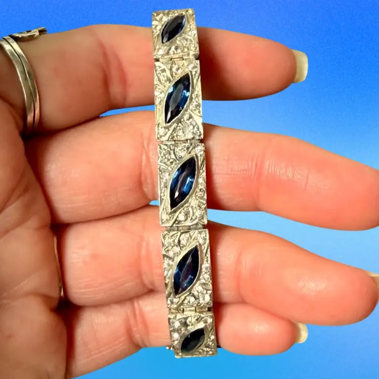Antique Art Deco Sterling Silver & Sapphire Paste Bracelet circa 1920’s. An exquisite original Antique Art Deco Paste Bracelet made in Europe around 1920. Crafted in high quality 925 sterling silver and set with flat-top marquise and round paste glass stones. In very good vintage condition for its age, with age appropriate surface wear – none of which is at all noticeable when wearing. Stamped Sterling bracelet is a perfect example of silver and paste jewellery from the art deco era. Increasingly hard to find in original condition such as this.