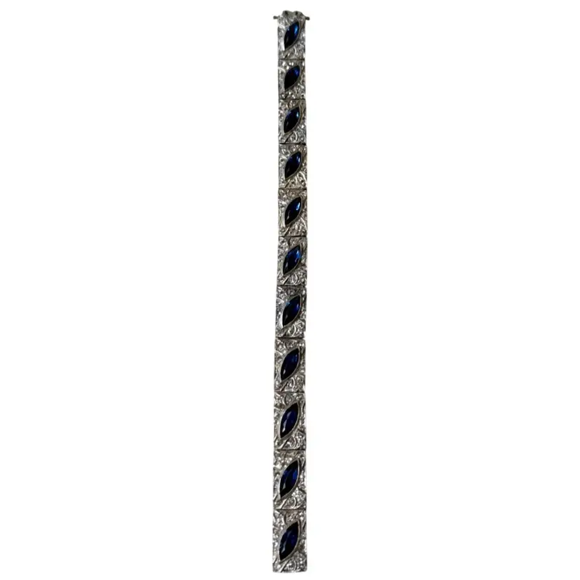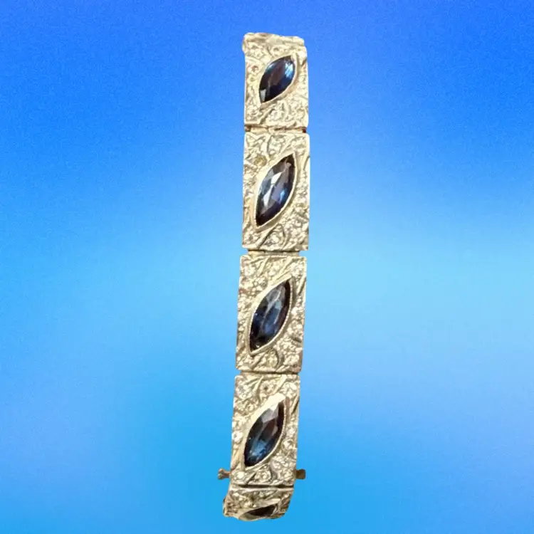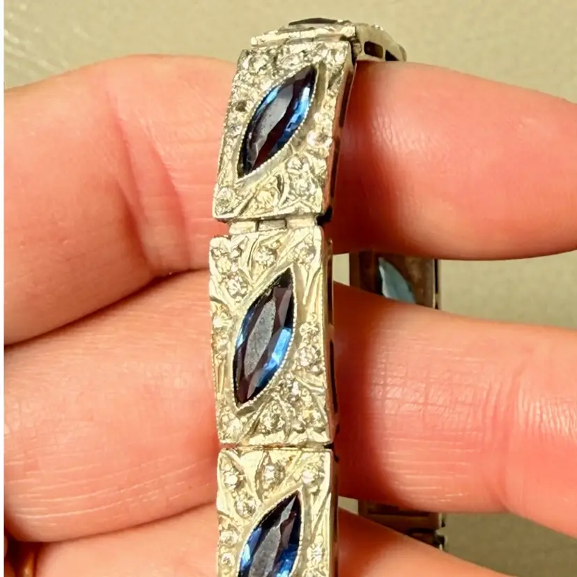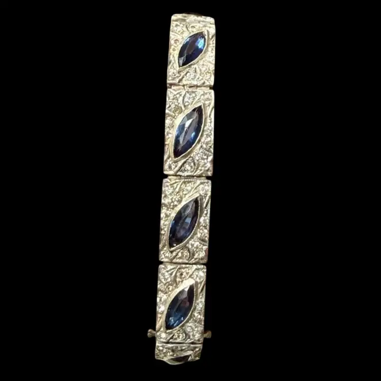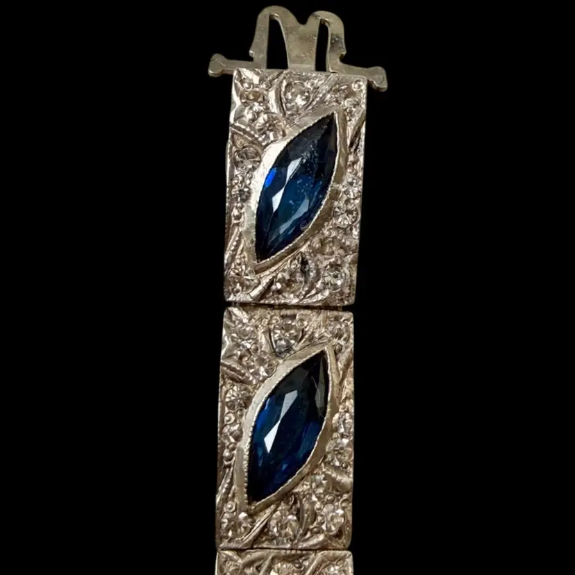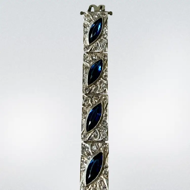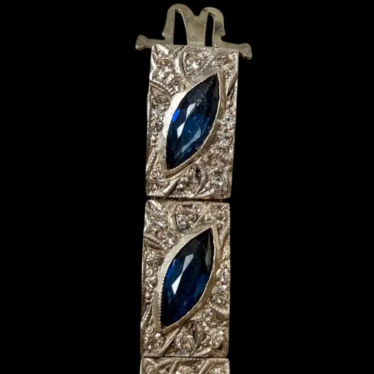 Antique Art Deco Sterling Silver & Sapphire Paste Bracelet circa 1920’s. An exquisite original Antique Art Deco Paste Bracelet made in Europe around 1920. Crafted in high quality 925 sterling silver and set with flat-top marquise and round paste glass stones. In very good vintage condition for its age, with age appropriate surface wear – none of which is at all noticeable when wearing. Stamped Sterling bracelet is a perfect example of silver and paste jewellery from the art deco era. Increasingly hard to find in original condition such as this.