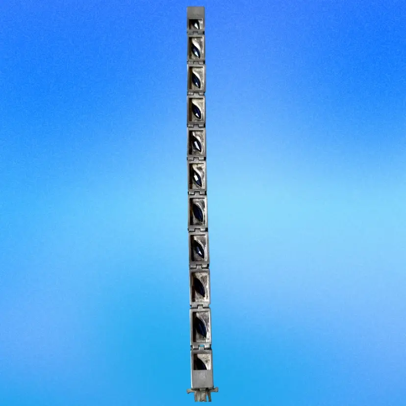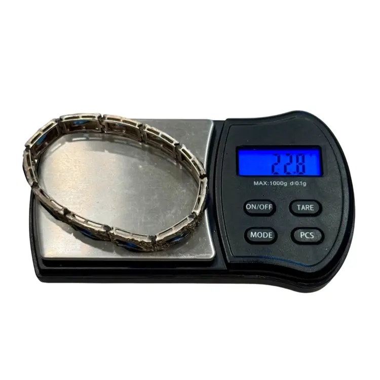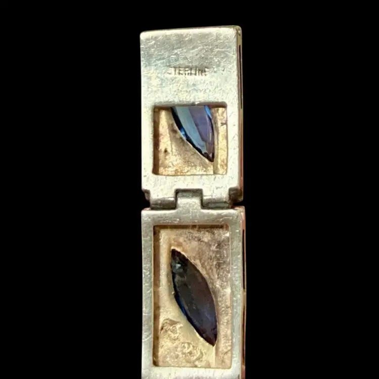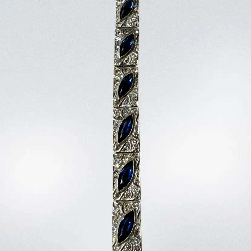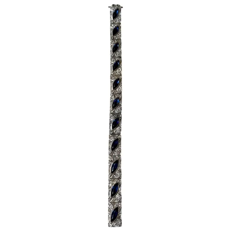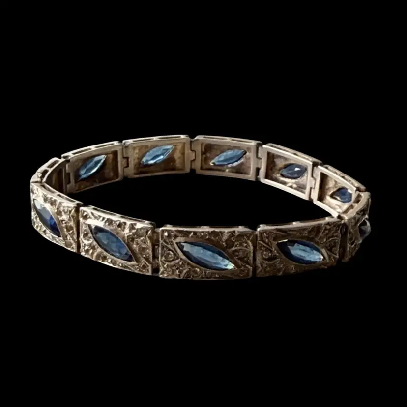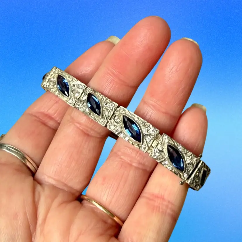 Antique Art Deco Sterling Silver & Sapphire Paste Bracelet circa 1920’s. An exquisite original Antique Art Deco Paste Bracelet made in Europe around 1920. Crafted in high quality 925 sterling silver and set with flat-top marquise and round paste glass stones. In very good vintage condition for its age, with age appropriate surface wear – none of which is at all noticeable when wearing. Stamped Sterling bracelet is a perfect example of silver and paste jewellery from the art deco era. Increasingly hard to find in original condition such as this.