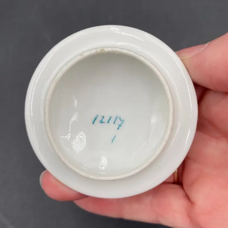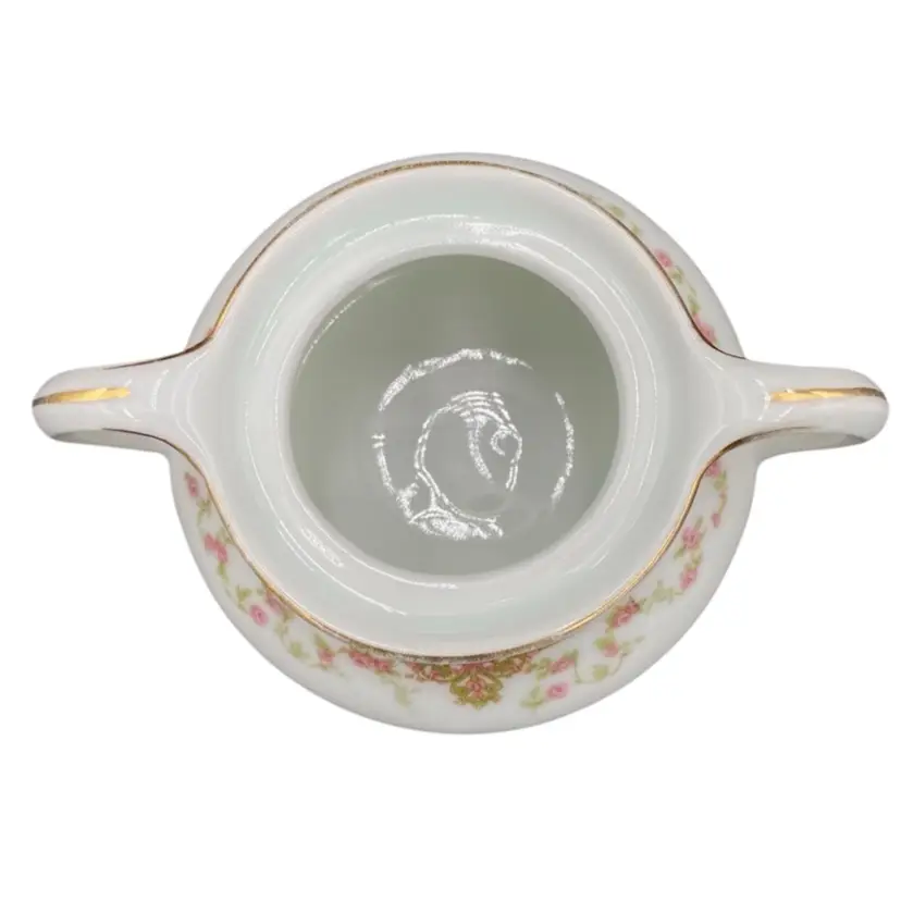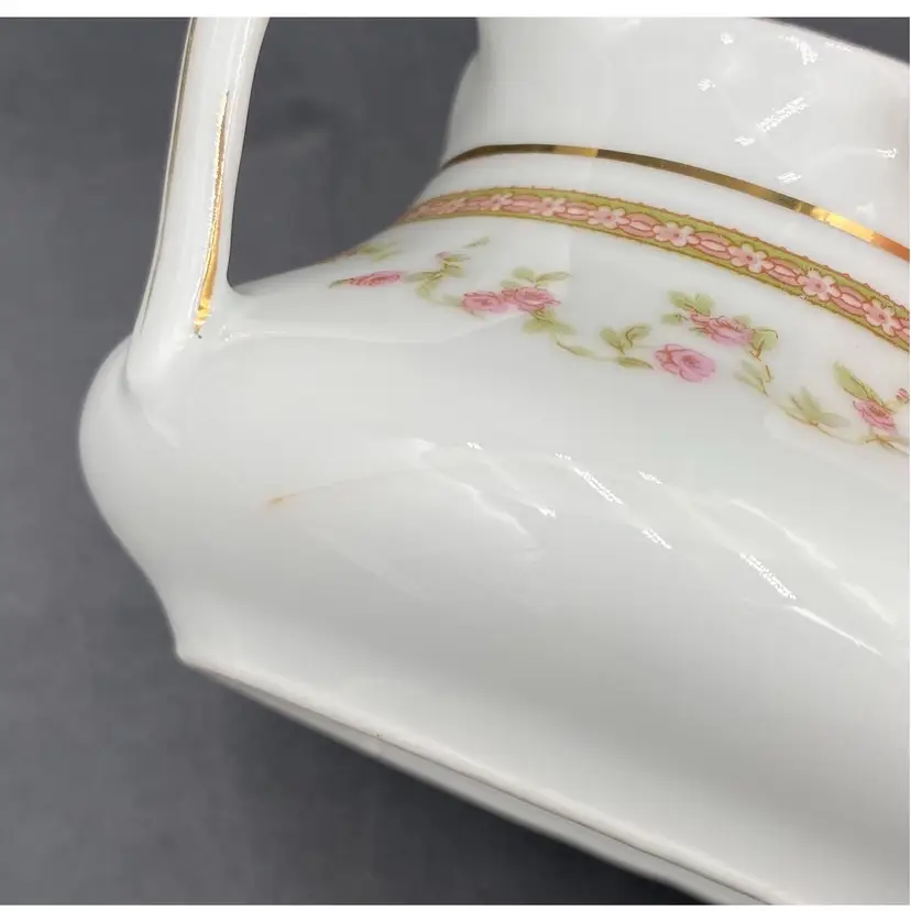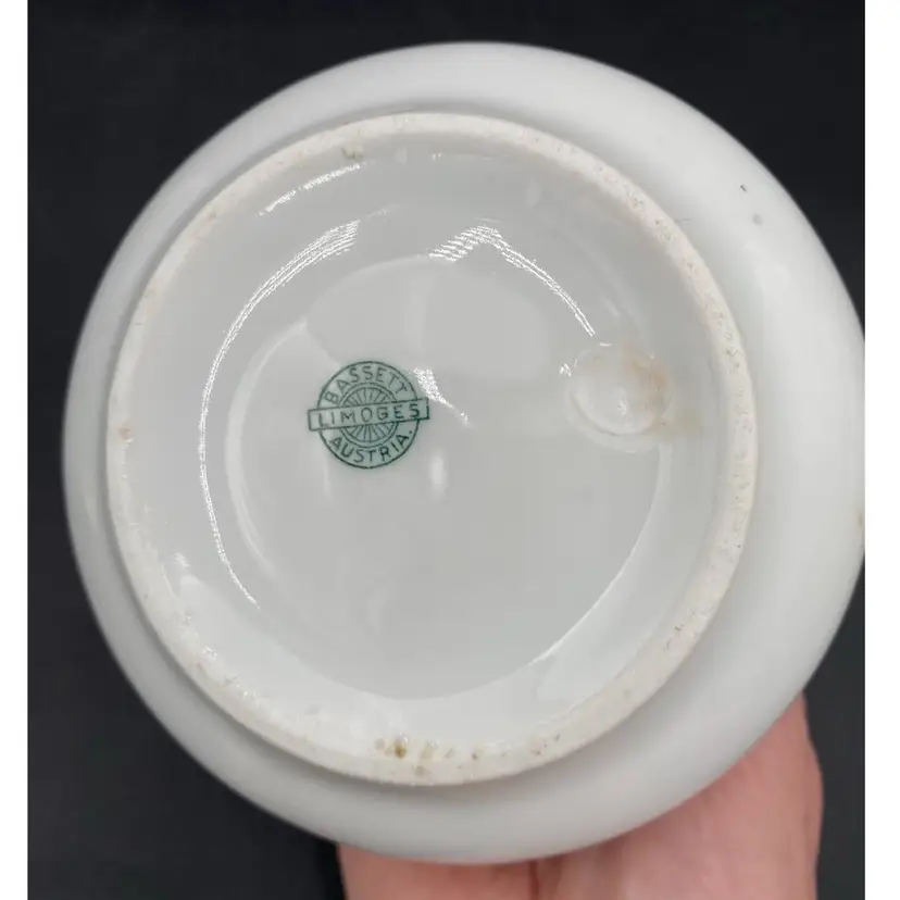 The sugar bowl is in good used condition. The decals remain vibrant and intact. The gold gilt trim is in very good condition, with only the very top of the lid showing any wear. The porcelain is in good condition: there is an external hairline crack on the lower portion of the bowl, but it does not go through the porcelain into the inside (see last picture). There is a smooth divot on the underside of the bowl (see picture 11). This seems to have come from a glitch in the manufacturing process, as are a few little bumps on the underside edge.
