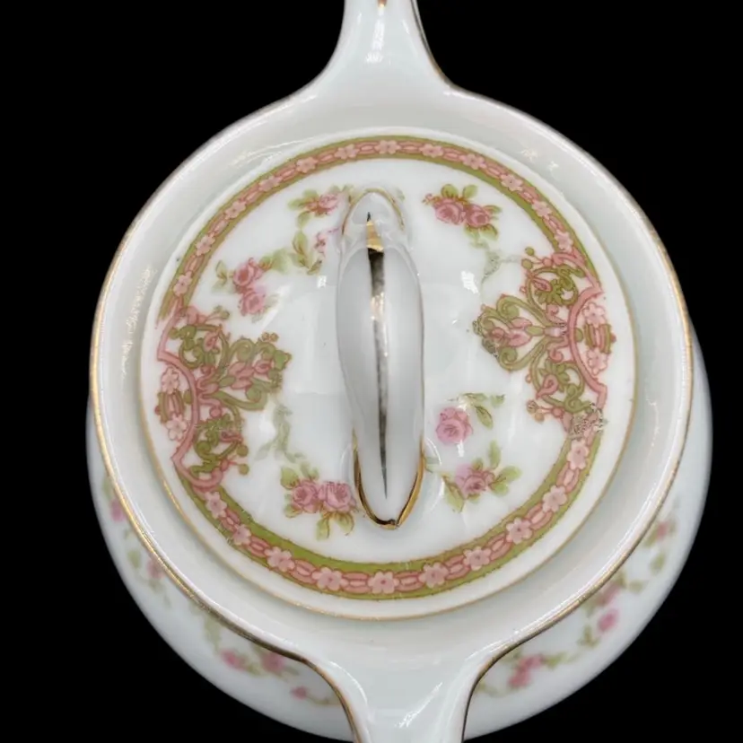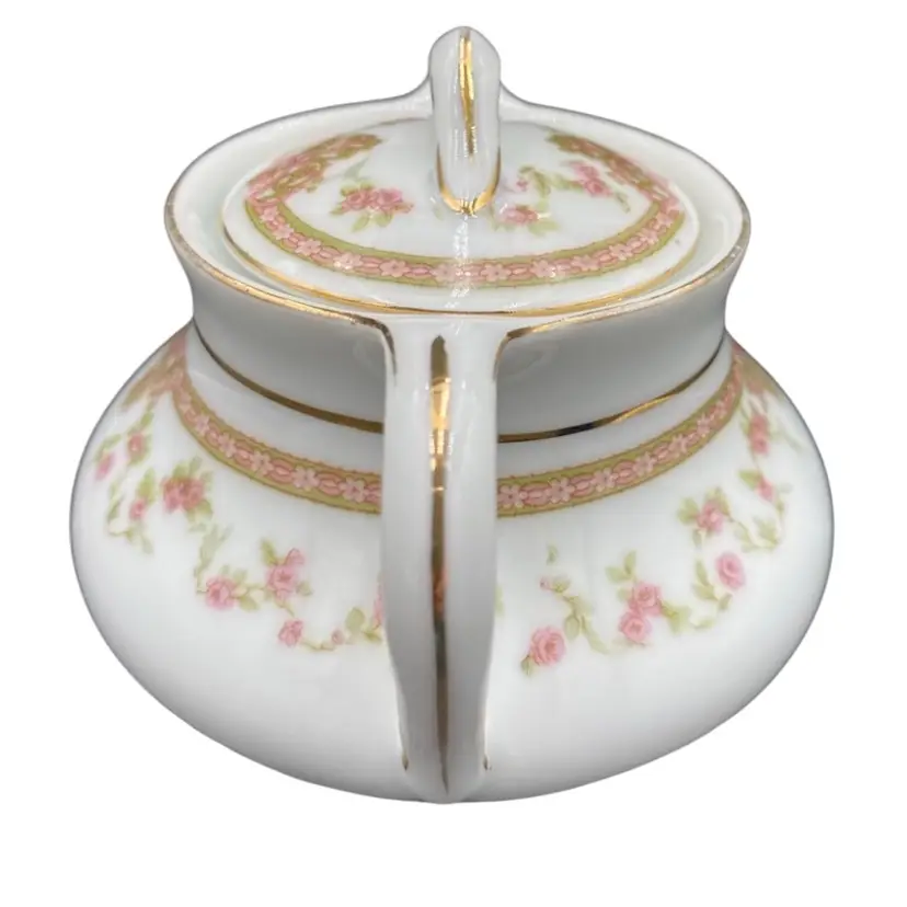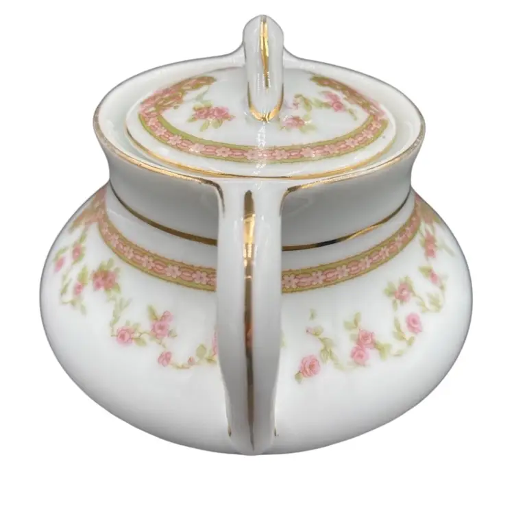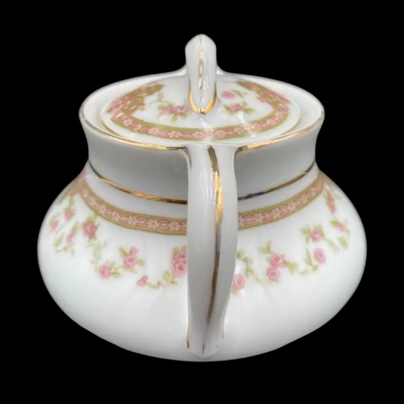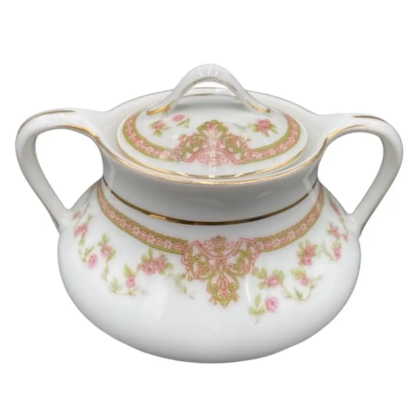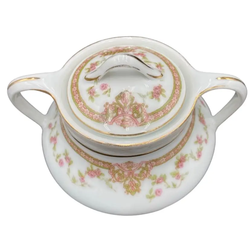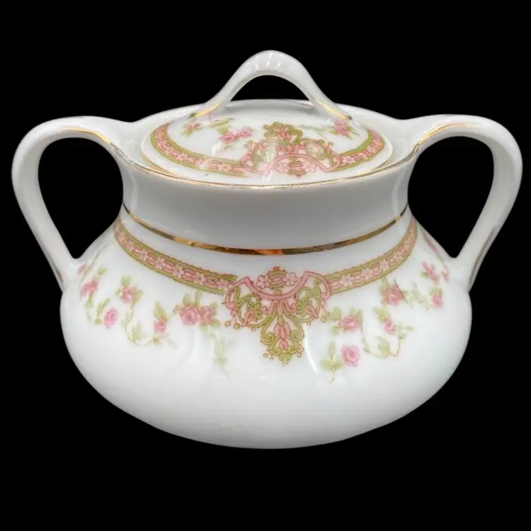 This antique Bassett Limoges sugar bowl is a stunning addition to any collection. It is pattern BSS21, featuring a beautiful floral pattern of pink roses with swag greenery, gold gilt decoration, and a glossy finish. The lid adds an extra touch of elegance to the piece. Crafted from porcelain, this medium-sized sugar bowl is hand-decorated and dates back to the early 1900s. It is an original manufactured in Austria during the time period of 1870-1914.