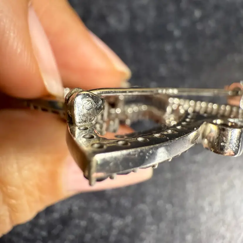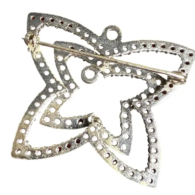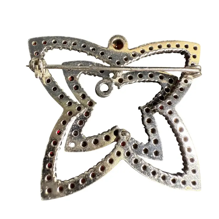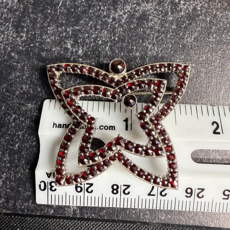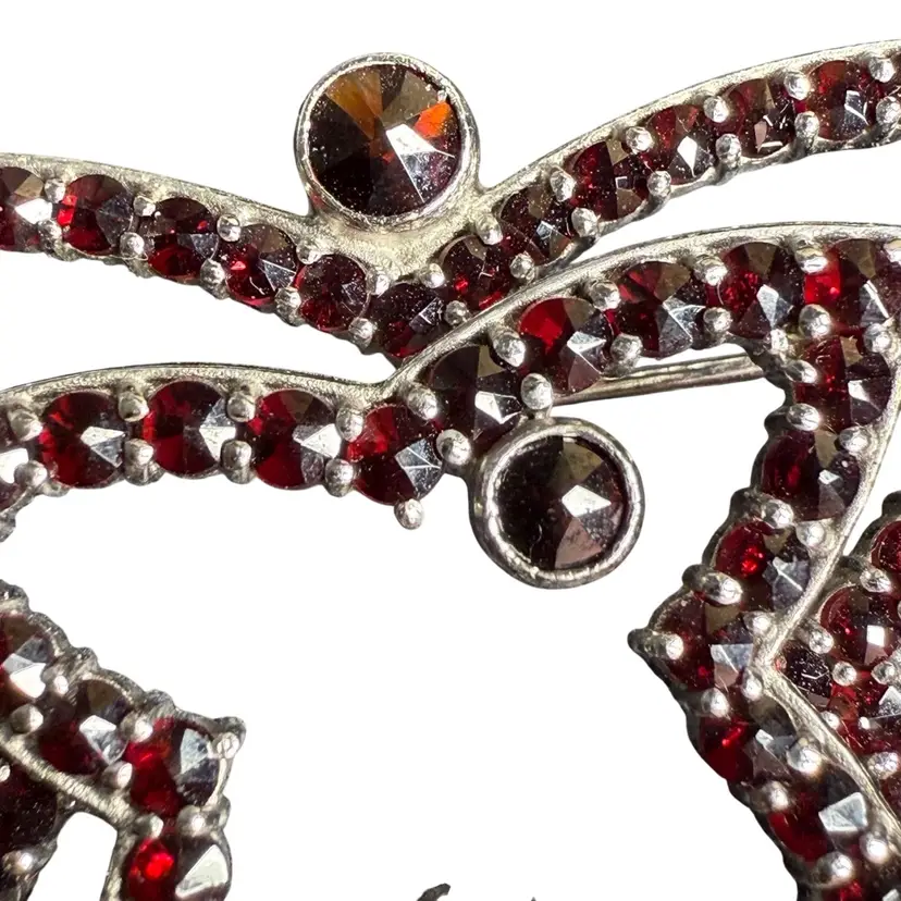 Victorian bohemian garnet brooch from the latter part of the 19th century. It is stacked in 2 layers and features rose cut garnets, of various sizes, all prong set. Some Sterling/maker’s hallmarks are present but are not clear enough to read.
