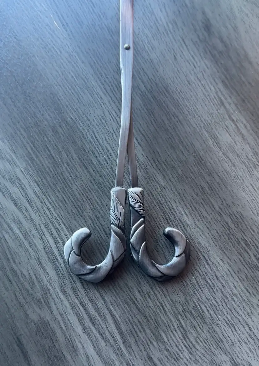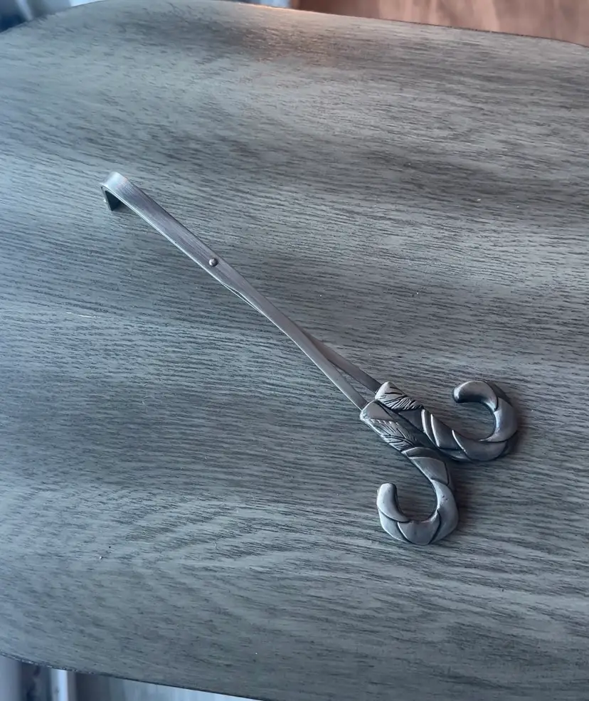 This Antique Collectible Pewter Leaf Designed Scissor Handle Wick Trimmer is a unique and stylish addition to any candle lover's collection. The silver color and antique design give it a timeless appeal, while its originality adds to its value as a rare find. 8”H x 3”W.