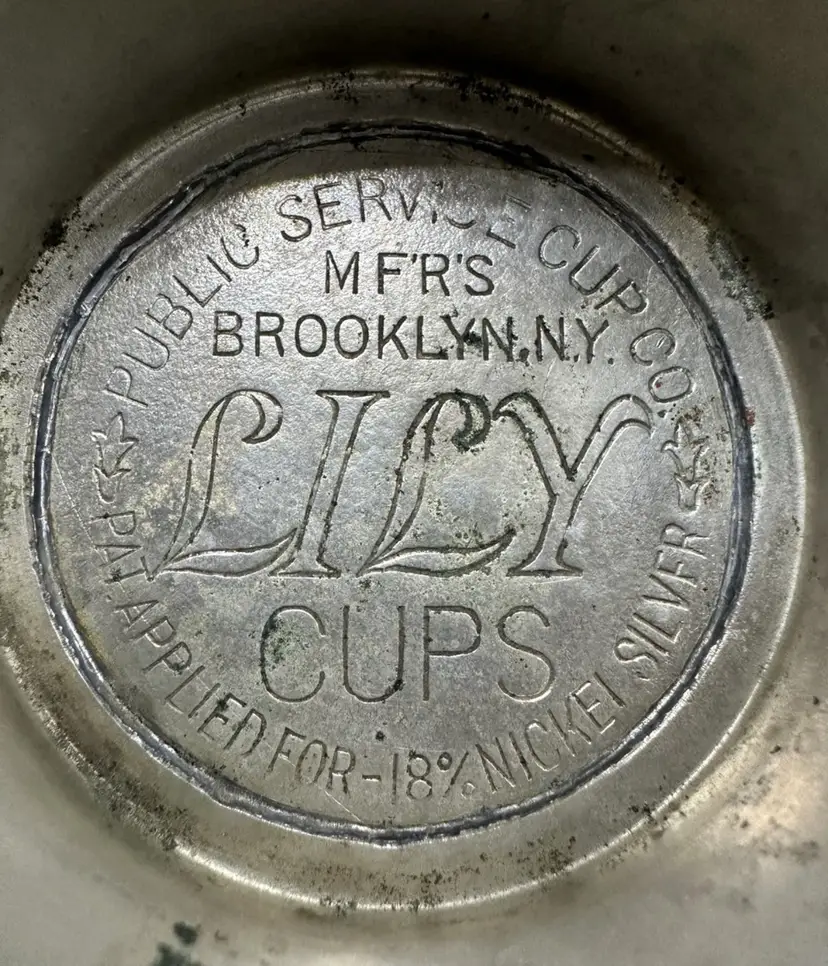 Set of 3 Antique Lily Cups ice cream holders, likely dating back to around 1914. These holders were used in soda fountains to serve ice cream or sundaes in disposable paper cups. The text on the bottom indicates that they are made of 18% nickel silver and were manufactured by Public Service Cup Co. in Brooklyn, NY. They measure 4” tall.
