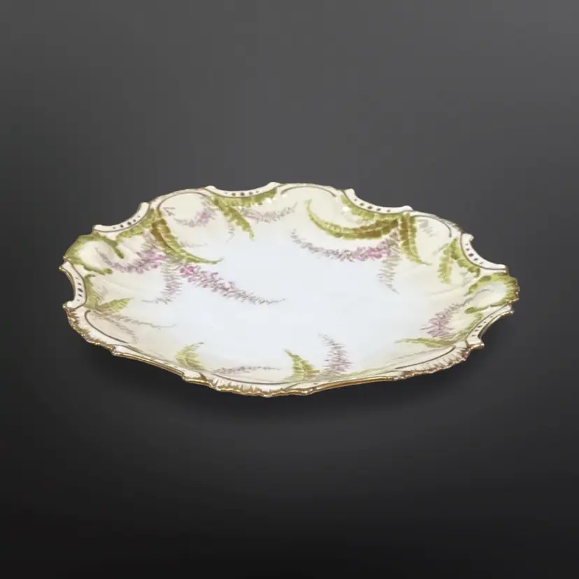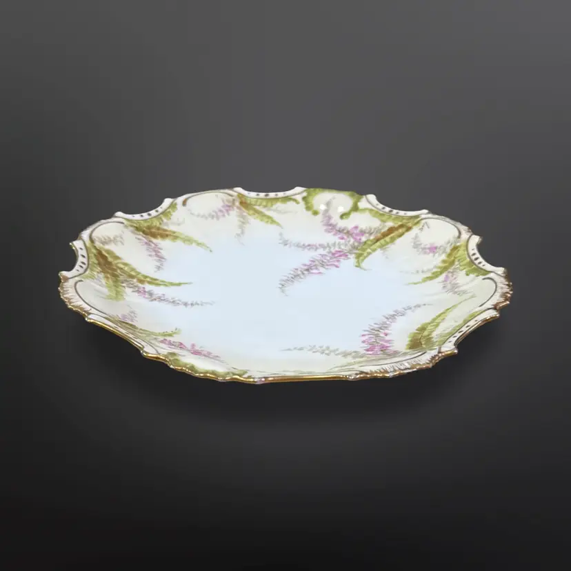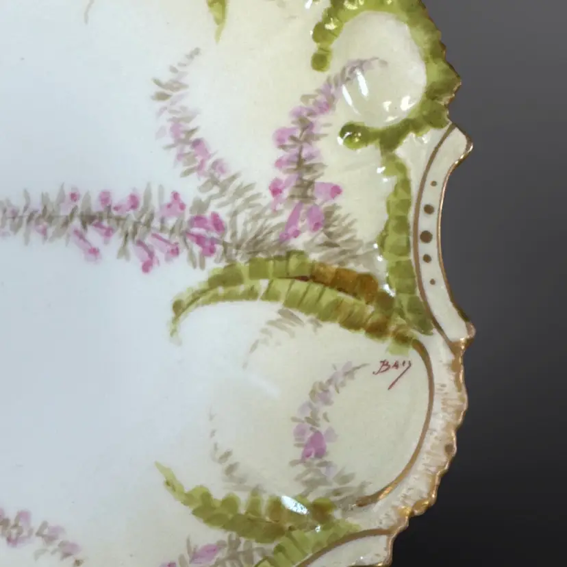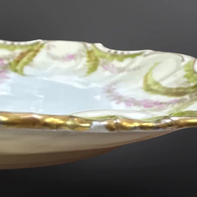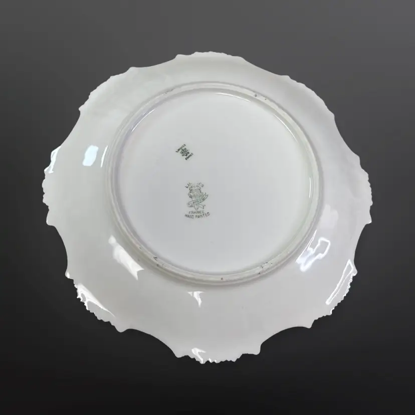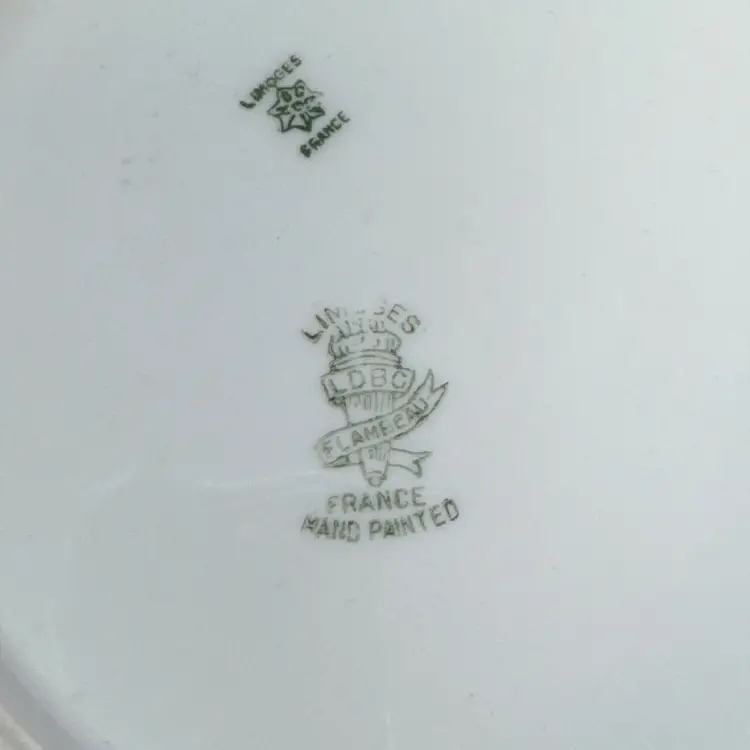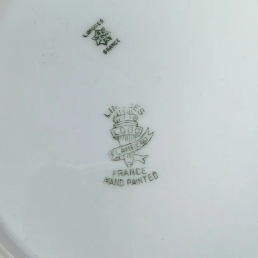 Beautiful hand painted Limoges France LDBC Flambeau scalloped edge plate with pink and green floral pattern and gold accents. The Flambeau torch mark dates the piece to 1890-1914. In very good vintage condition; one very small chip on an edge and some light wear to the gold. Measures approximately 8.5” in diameter.