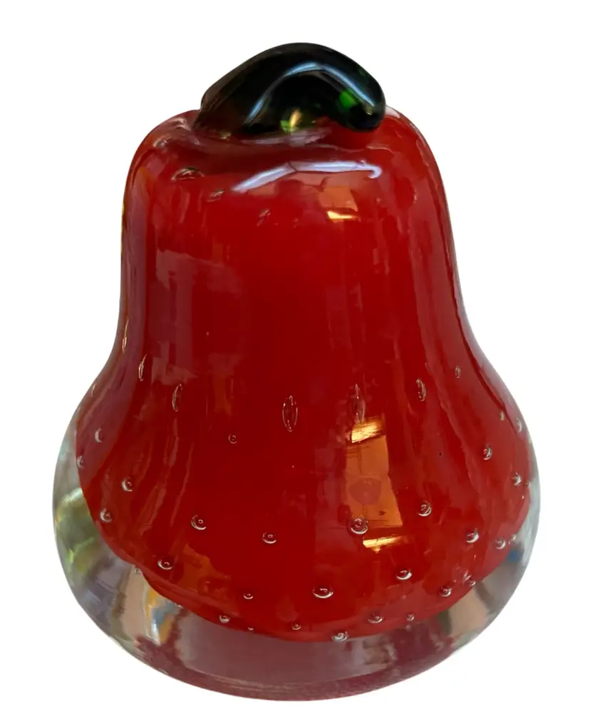 This is a vintage art glass pear paperweight with controlled bubbles (bullicante technique). It features a red glass body and a black glass stem