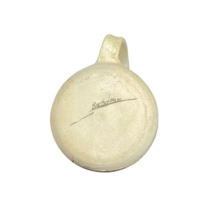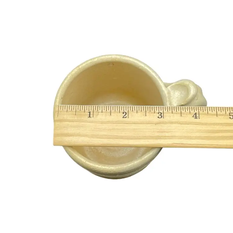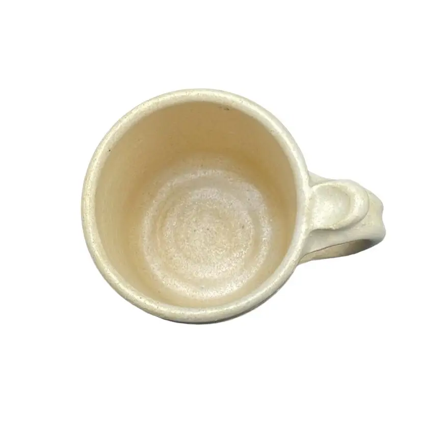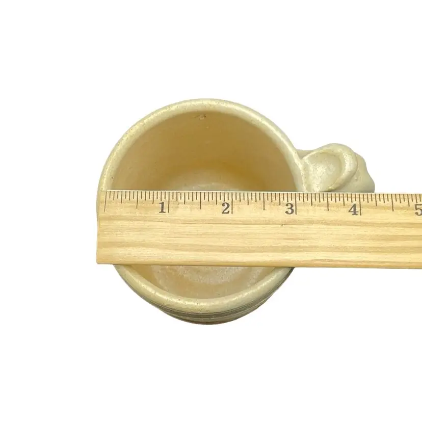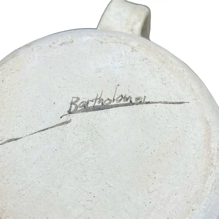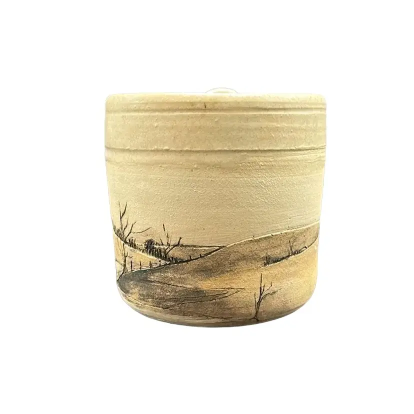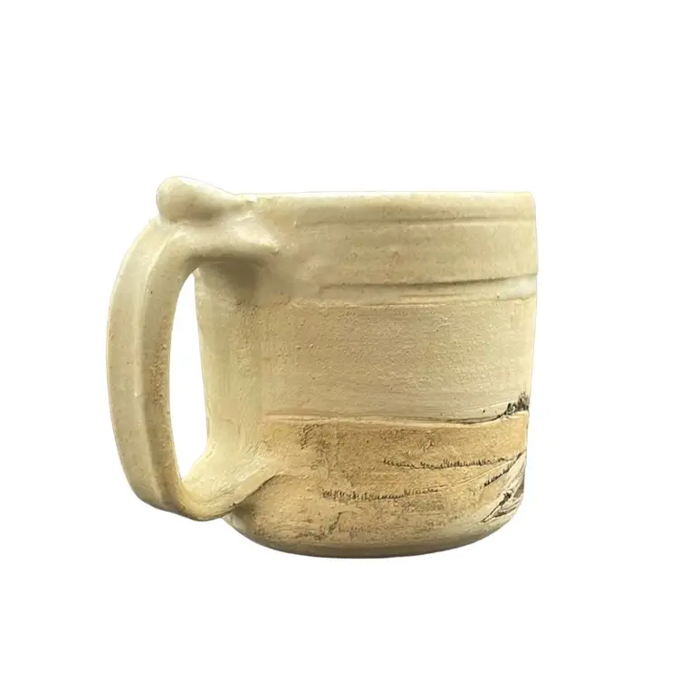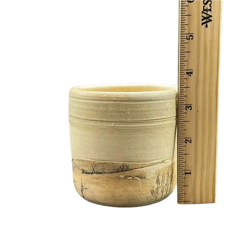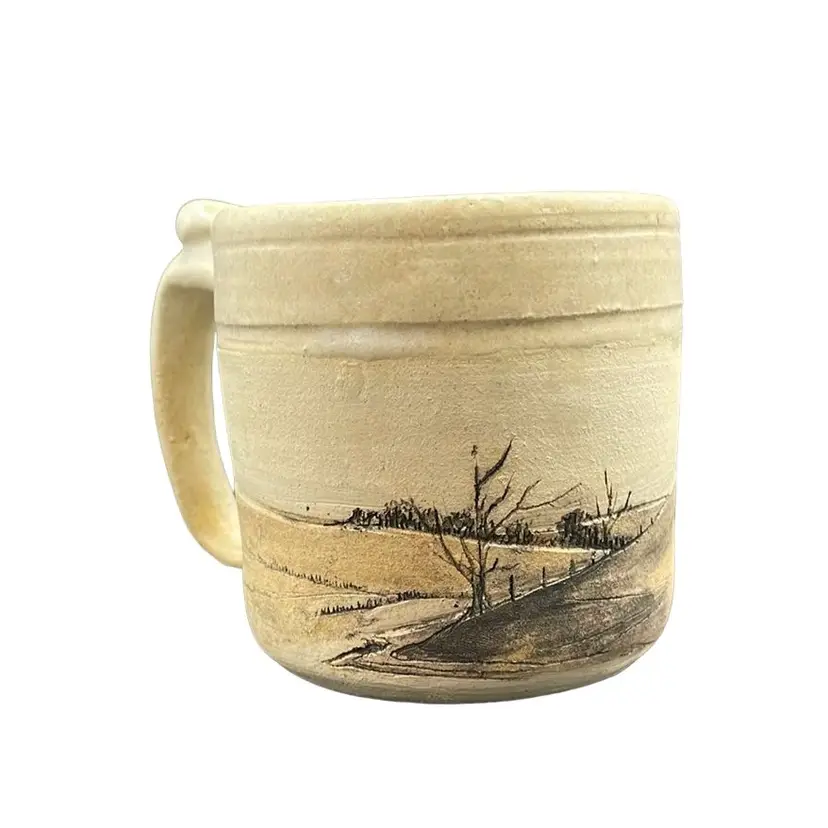 This is a handmade art pottery stoneware mug depicting a rustic landscape scene. Signed on bottom by artist. Measures approximately 3.5" tall x 3" across, and holds approximately 12fl oz. No chips or cracks, but there is a maker's flaw on the inside as shown in picture 9.