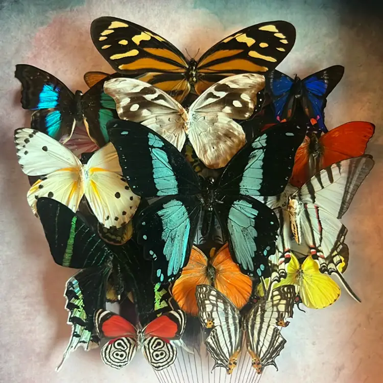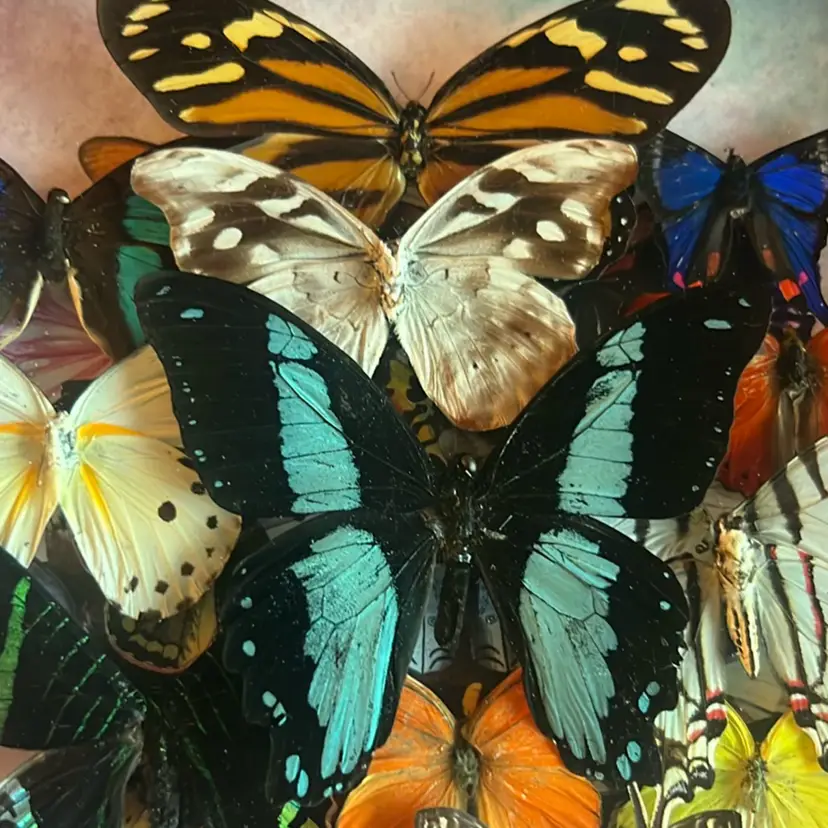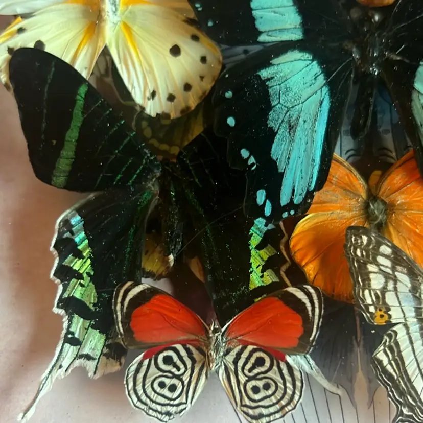 13 amazing butterflies mounted on a fun vintage inspired print. Made by a local Salt Lake City artist. Simply stunning. No damage