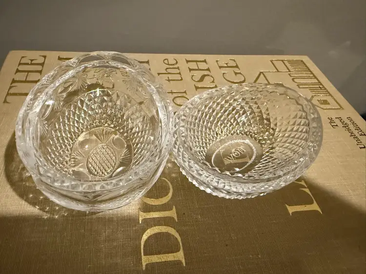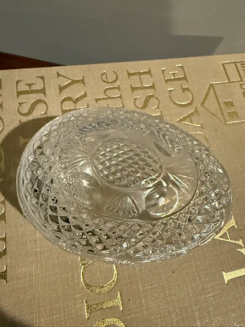 Vintage Avon Fostoria 1977 Clear Glass Egg shaped dish with lid. Features an intricate diamond cut pattern and sunburst details, suitable for use as a trinket box, soap dish, or candy bowl. This collectible piece was manufactured by Fostoria specifically for Avon.