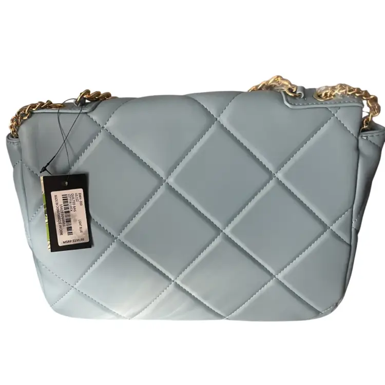 Beautiful soft blue with the gold hardware that stands out against this color makes for a great piece with any outfit .Made of Vegan Leather
