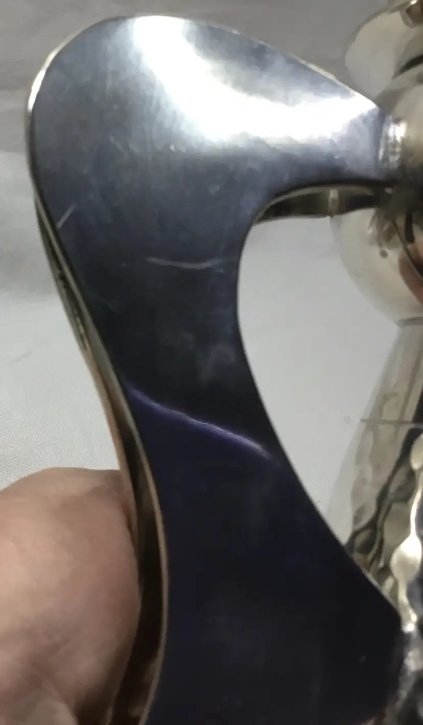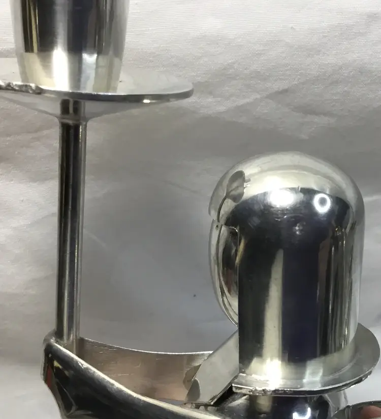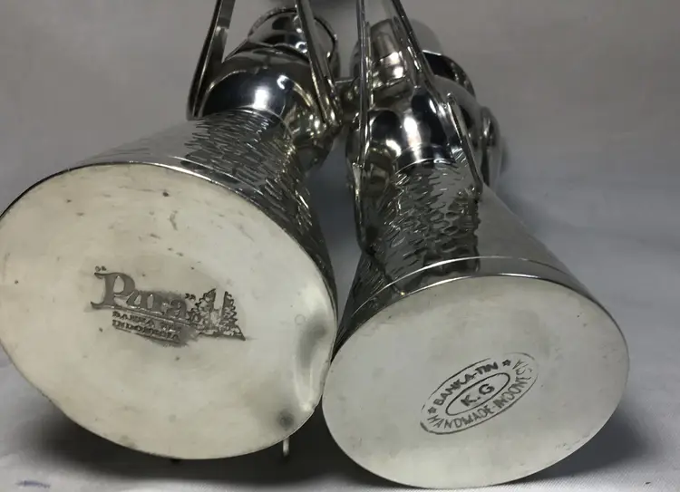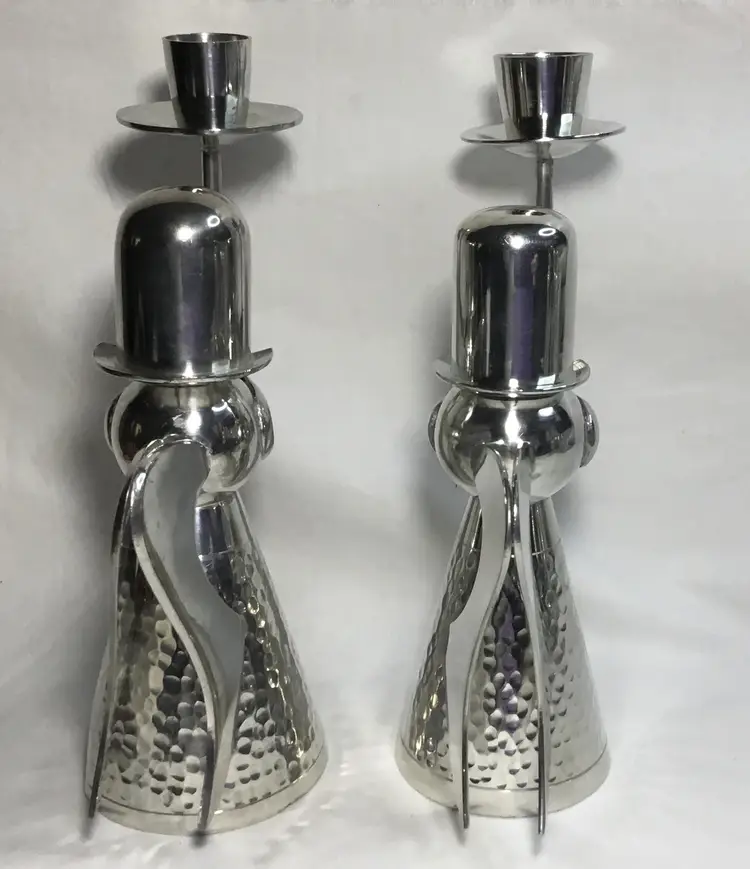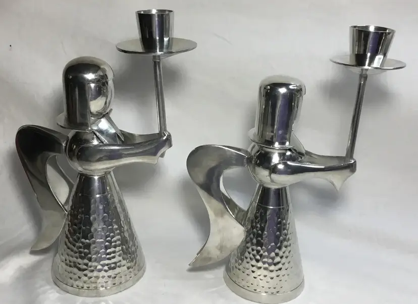 Set of 2 tin angel candle holders, one is 7.5 inches tall, other is 7.75 inches tall. these are hand made so there are minor differences. Both are aprox. 2 inches wide and 5 inches deep. Angels dress has a hammered texture, all other parts are smooth. Tip points of wings are a little sharp.