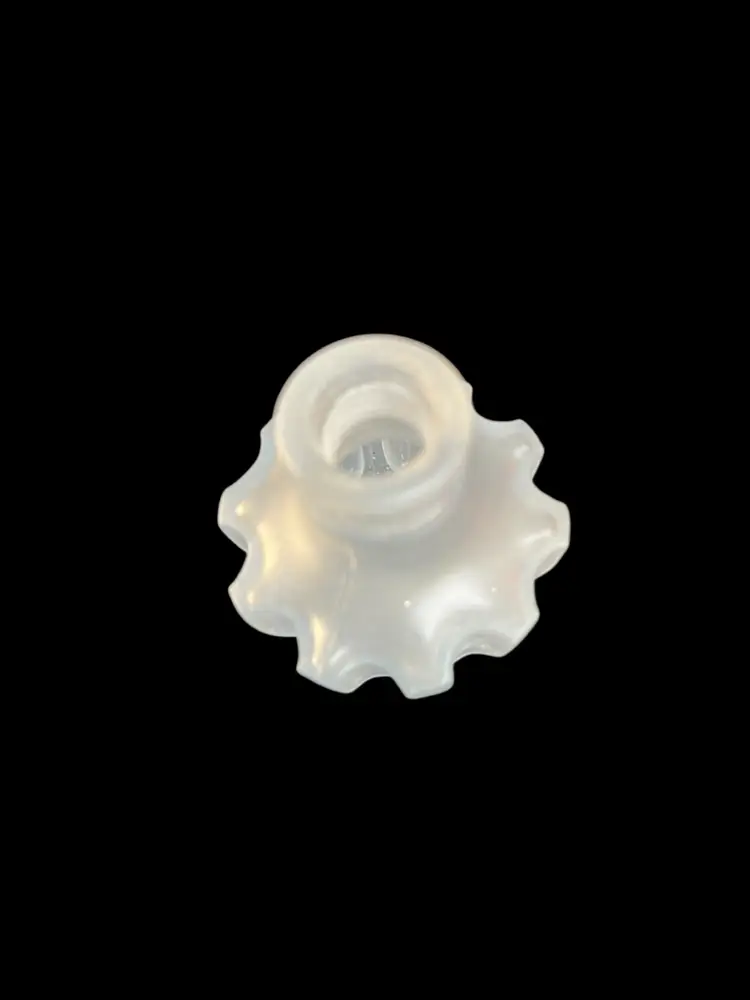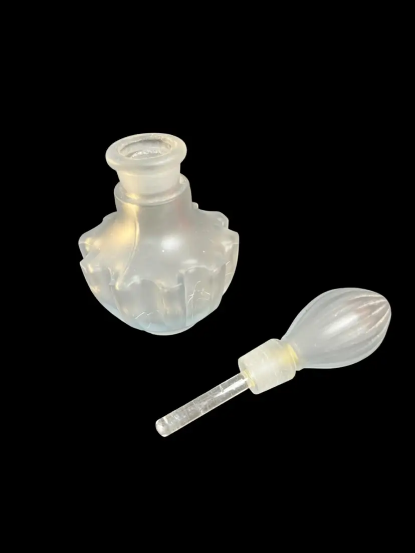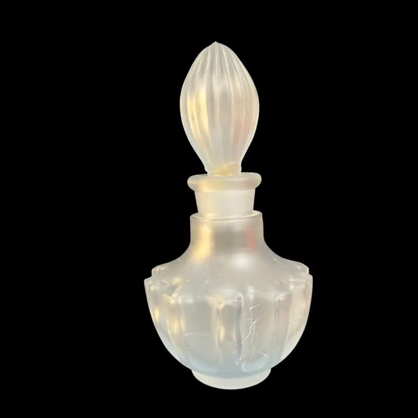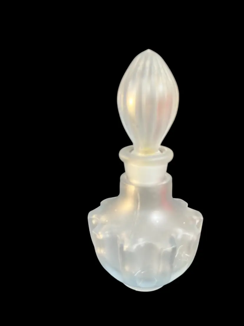 Cute little vanity glass perfume bottle. Within the ridges is very tiny spider web like lines, NOT cracks. I only see it in the right light. Dainty, feminine and screams everything boudoir. Is in good vintage condition. It measures approx 4"H, 2" Diameter, 2.4 Oz