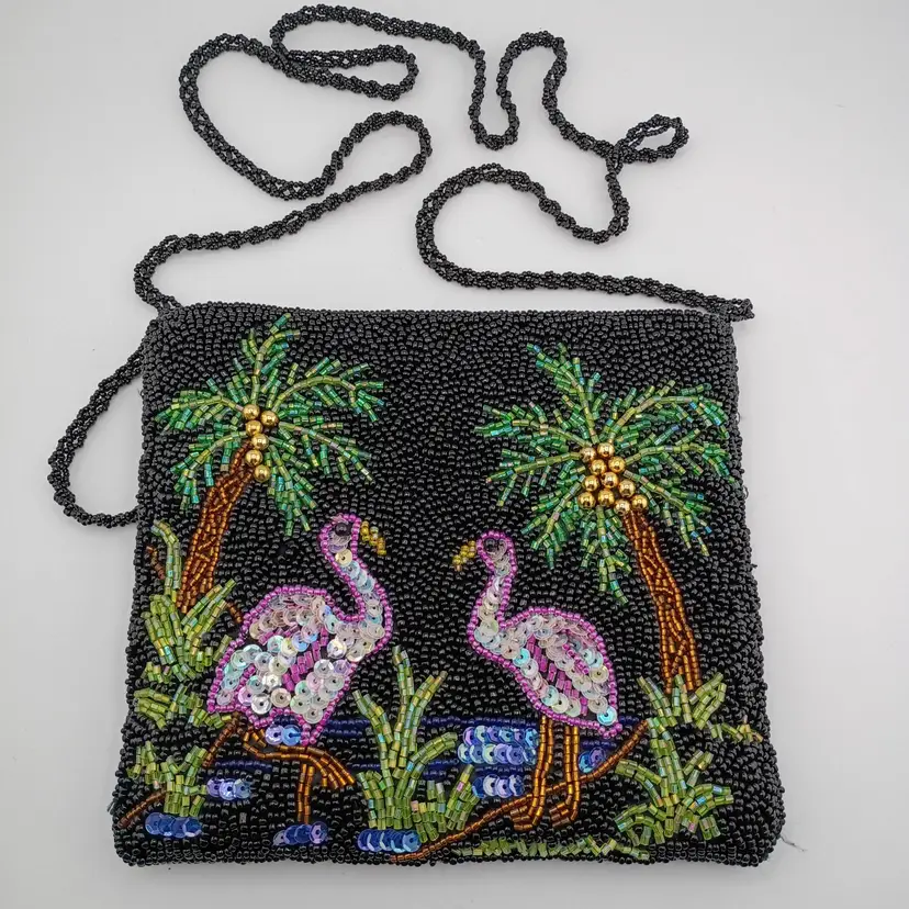 It's a fabulous beaded evening bag with flamingo and palm tree decoration. It has a very long beaded strap, is satin-lined, and is in excellent condition with no noted damage.