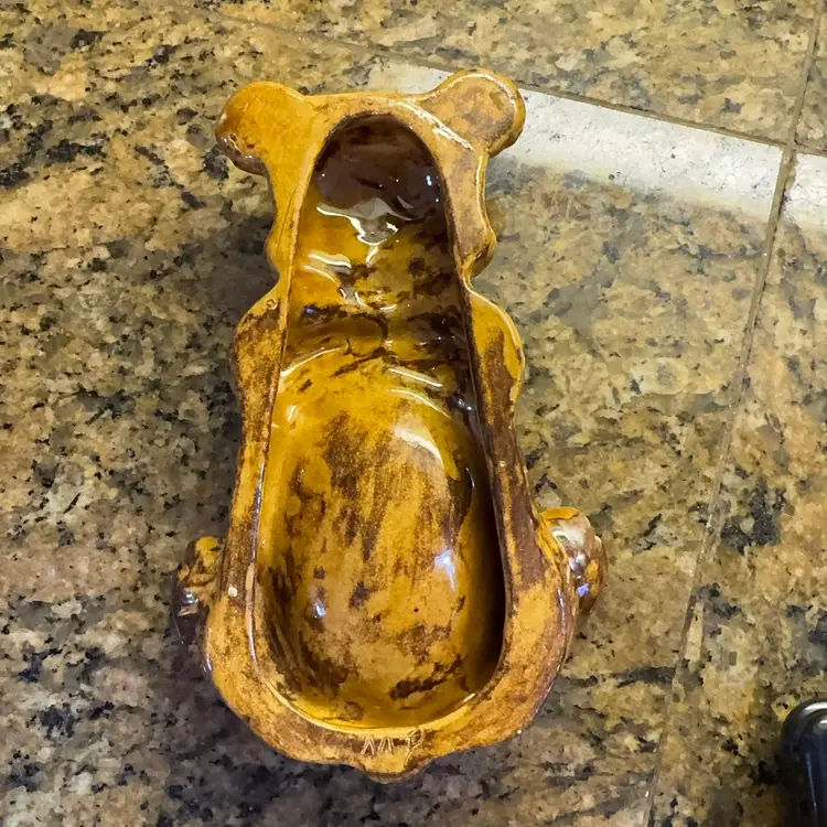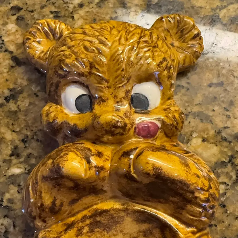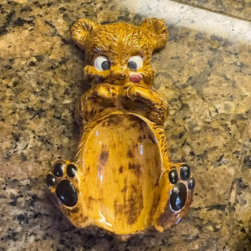 This vintage bear spoon rest is so cute! He has his tongue sticking out! Measures 6.75” long. No chips or crack cracks.