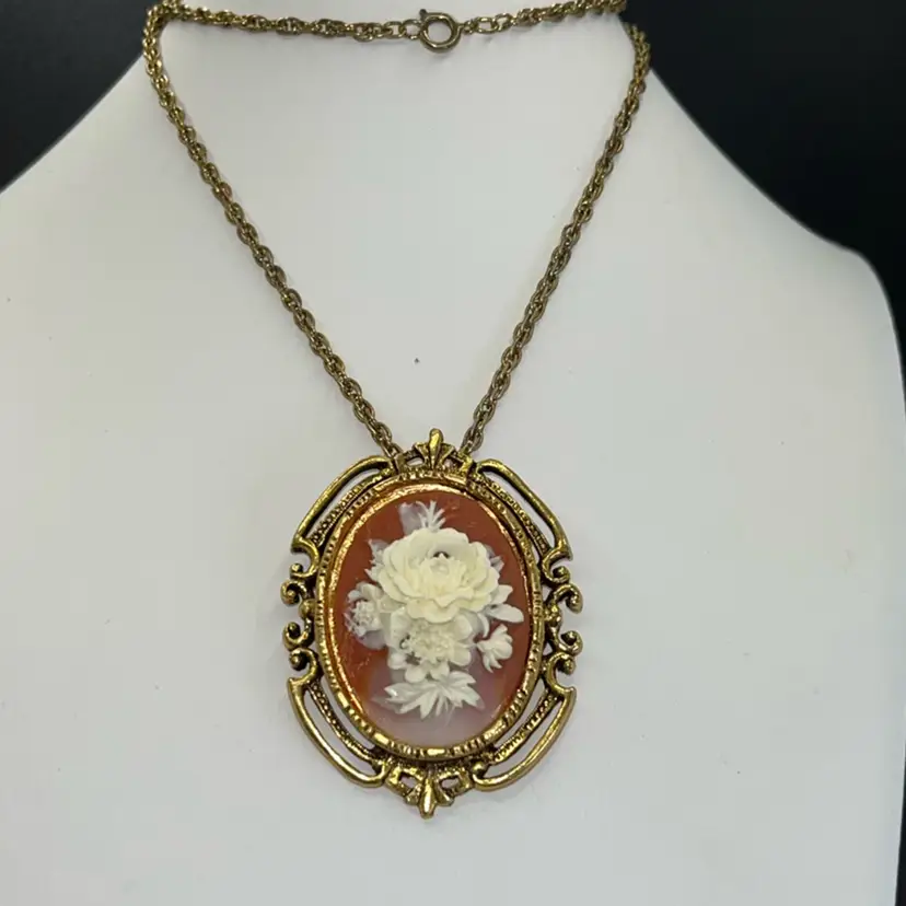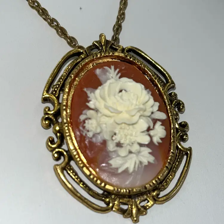 Beautiful, Gold Tone, Cameo Necklace, Large 2 1/2” Long Floral Cameo 24” Rope Chain, Spring Ring Clasp