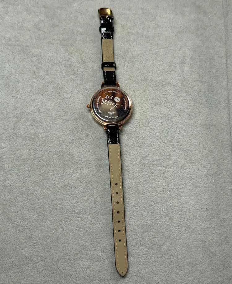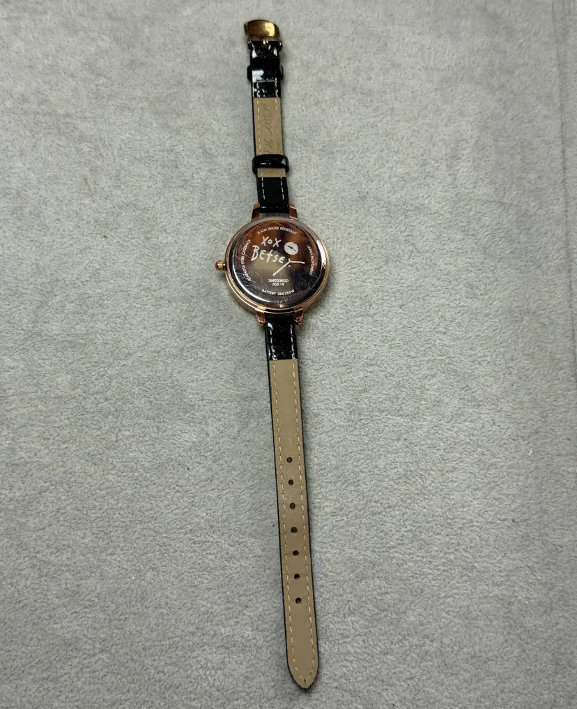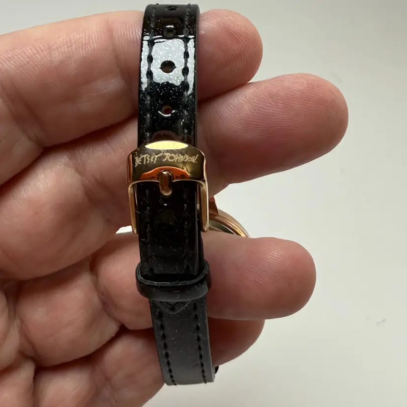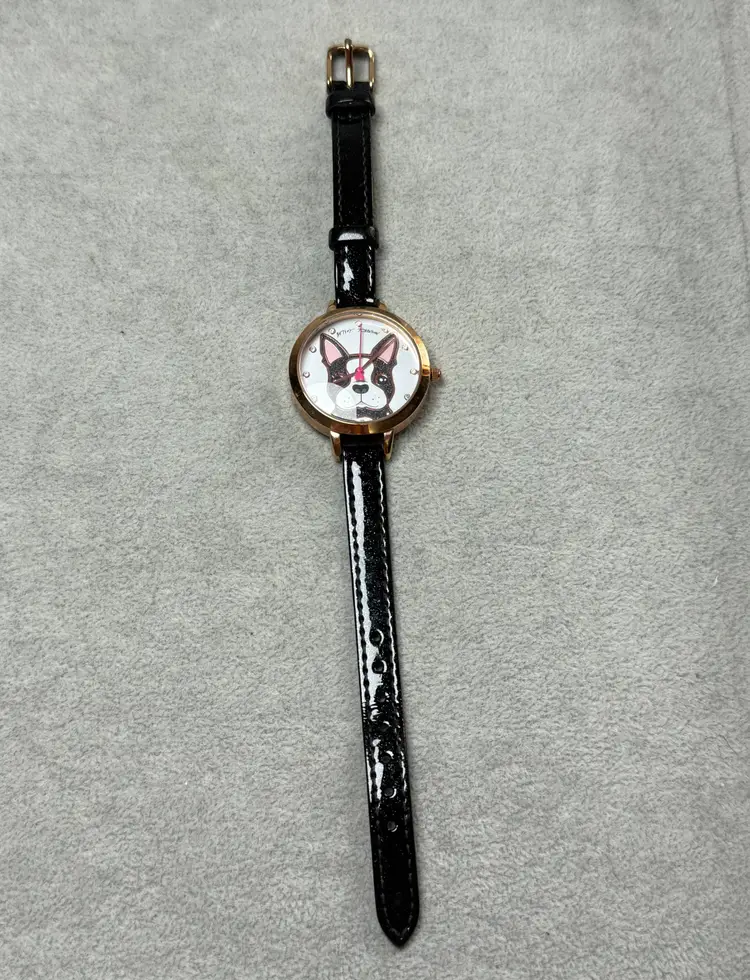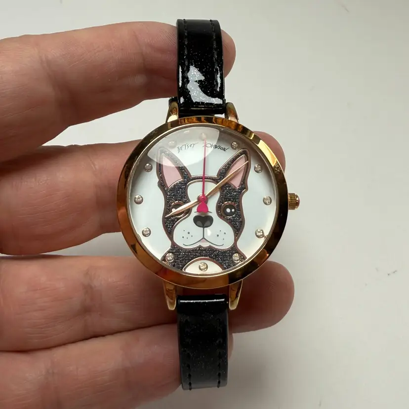 Betsey Johnson French Bulldog Frenchie Watch Gold Tone New Battery Works Black Metallic Specs Band. Will fit up to about 7.75" wrist. Awesome condition. I have replaced the battery and watch works great! Little to no wear. Japan movement.
