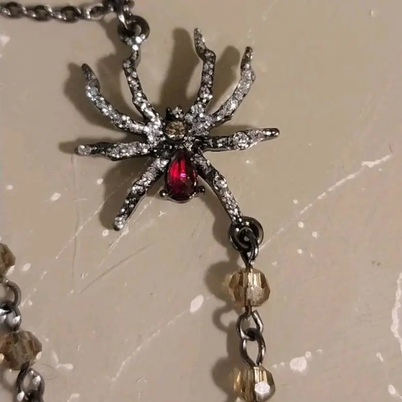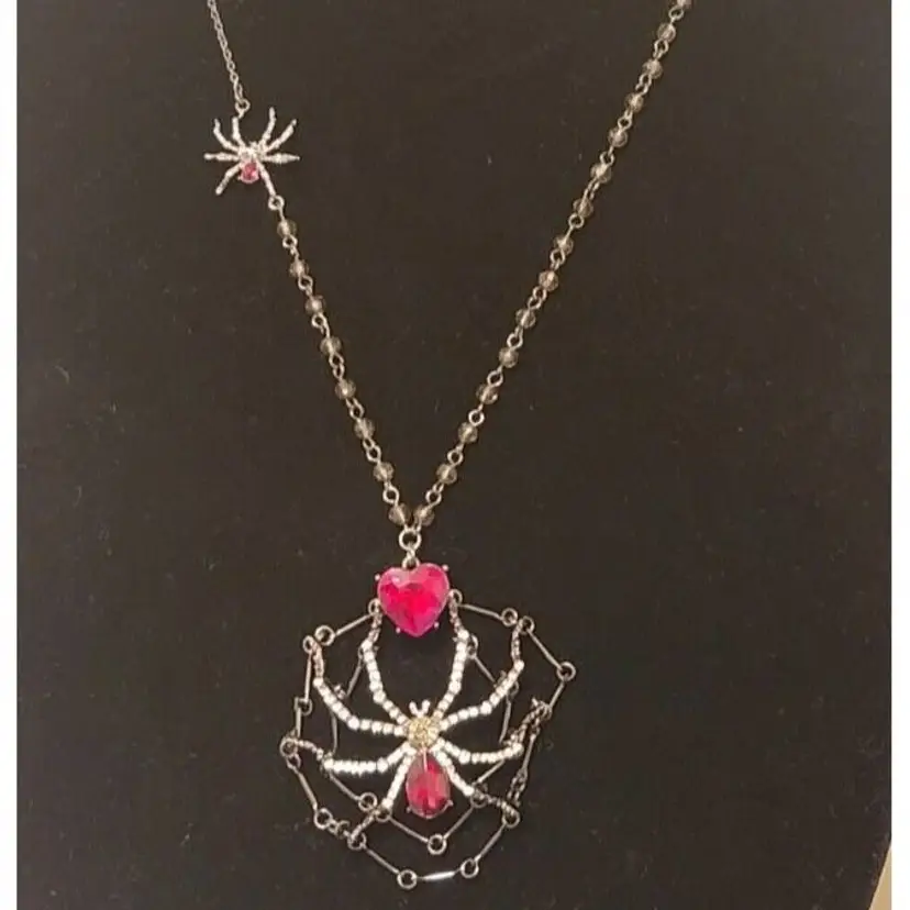 Betsey Johnson Gunmetal Tone Long Necklace Spider Web Red Gem Crystal Bead 32”