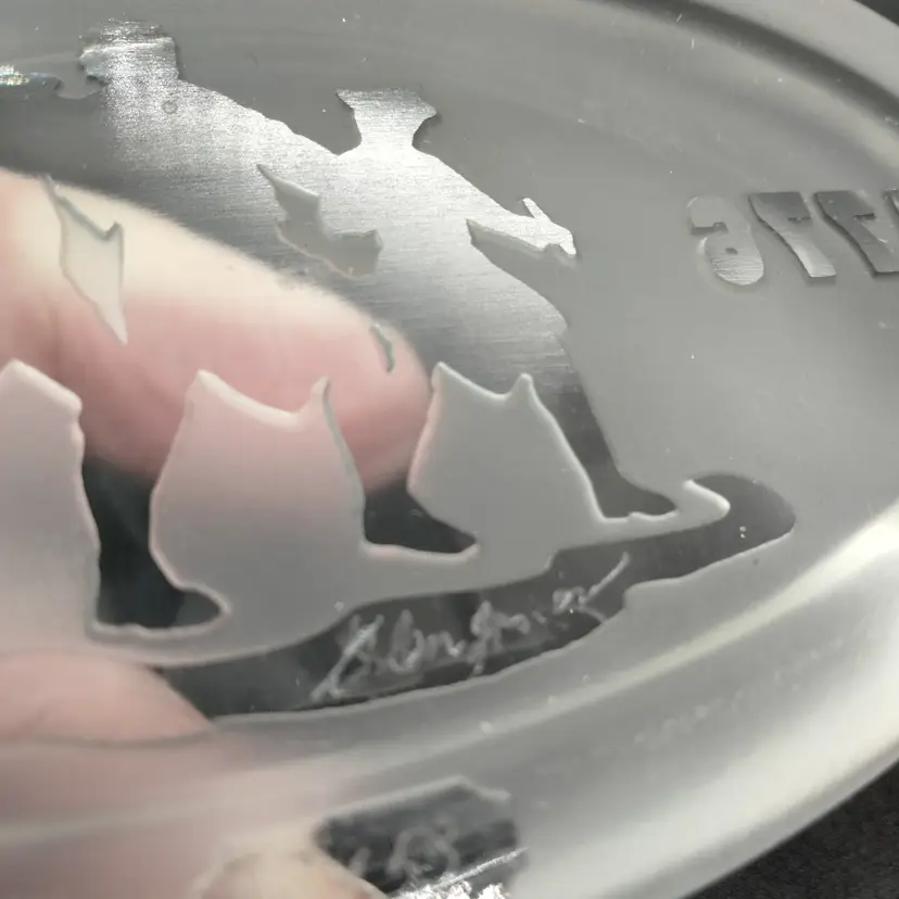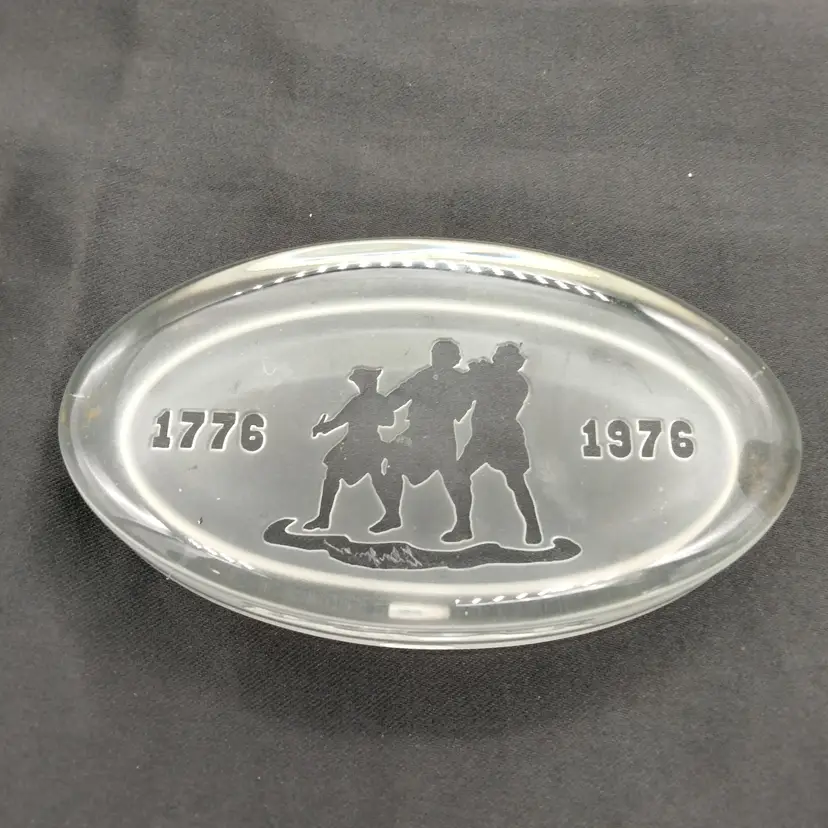 Bicentennial 1776-1976 Crystal Paperweight Glen Jones Signed Ltd Edition #7453 produced by Fischer Glass Studio in the mid 1970's . This is oval and shape and will stand on its side or lay flat on bottom. It is 5 inches long 2.75 inches tall and about 1 inch thick. This is preowned. No chips cracks or flea bites no scuff. This is a signed numbered limited edition. Excellent condition. Ships USPS